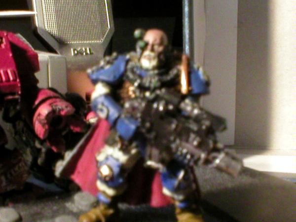 1 of 2; the lighting isn't so good so I may just take a picture of them again; the Techmarine has a lot of dents and scrapes as I haven't yet cut him a place in my carrier: He tends to break... a LOT... and it just gets tiring to repaint him