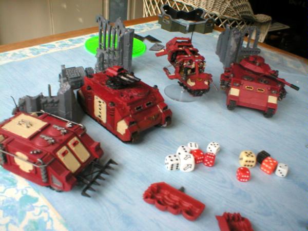 Old Rhino (from when I was like 9, obviously repainted), Razorback with Twin Lascannons, Landspeeder Storm and a Predator.
