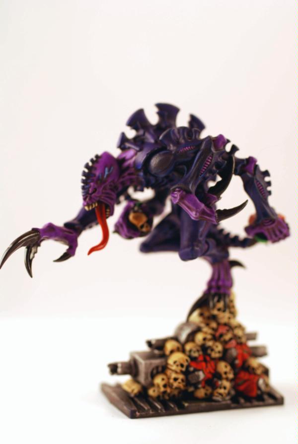 I can see all of the images, and it's a great paintjob. When it gets tricky to tell what is highlighting/shading and what is natural light and shadow, you're doing something right. Personally, I think genestealers look silly, generally (like goofy four-armed retro-future aliens in spandex jumpsuits that caught a mild case of the grimdark), but this guy snarling from his pile of skulls makes me think "RUN!" would be a more appropriate response than "what a pretty purple" if I saw him at the end of an alleyway. Thumbs up!