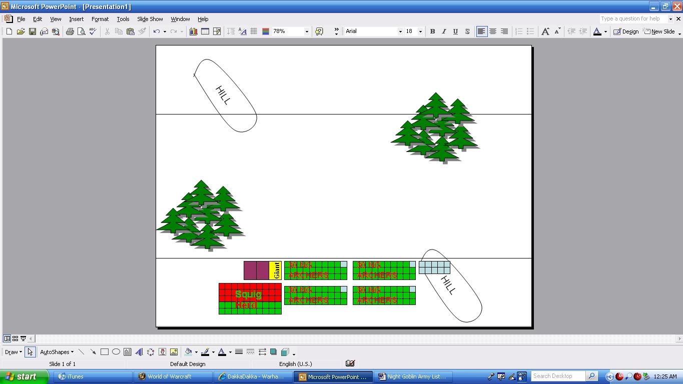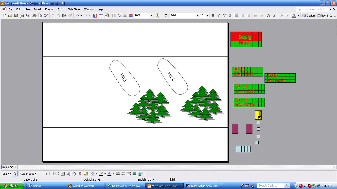 Well I was a bit curious on how I could set up my upcomming "most creative way to lose" Night goblin army for the most over all fail! So I tried some things on power point and turns out this might be useful for actually trying out different set ups for your army and you can switch around the terrain too... your probably like wow... your smart... not really... I could have done that... Well I would hope you could do it cause its really easy, just something I never thought of... 1. Get an Army list 2. Make a large square 3. Put lines through the square till you have what looks like your unit set up... For example my 10x3 units of Night Goblin Archers, even got blue squares to mark characters! (just make seperate squares and order them to be on top... wow) 4. DO NOT MOVE ANYTHING! just highlight it all, right click, scroll to grouping and group them 5. Copy and paste if you have multiple of the unit 6. Repeat till your army is done... I added lables to some of mine jsut for the hell of it. 7. Make some terrain. I used the auto shape curves for hills... wrote in hill, grouped, and copied/pasted it... Found a basic shape tree. copy/pasted a bunch, grouped, copied a second.. easy right? 8. randomize the terrain as you would like 9. Set up! Its pretty easy and you can try out many set ups and mess around with the terrain and etc... It may not be the best way to do it but its kinda cool ( I think it is at least <.< ) Just thought Id share... Let me know what you think! EDIT: Fixed the pictures! However they dont look amazing <.<