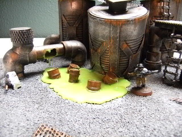 Nice piece, looks good to me! Some ideas, I try not to base features on an absoluely square cornered base as they look out of place on plonk and play boards, just rounding them off can make a world of difference, and maybe add more wrecked barrels for gangers to hide behind (unless you add more plonk n play, in which case I'll shut up)