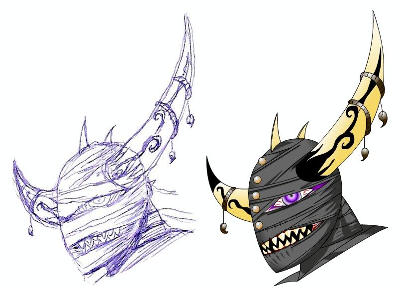 Yeah I was thinking about that too ...of course it'll look different when finished. To clarify the bandages will look like black leather straps adorned with gold studs bolting it to the head. I'll get to work on a colored version