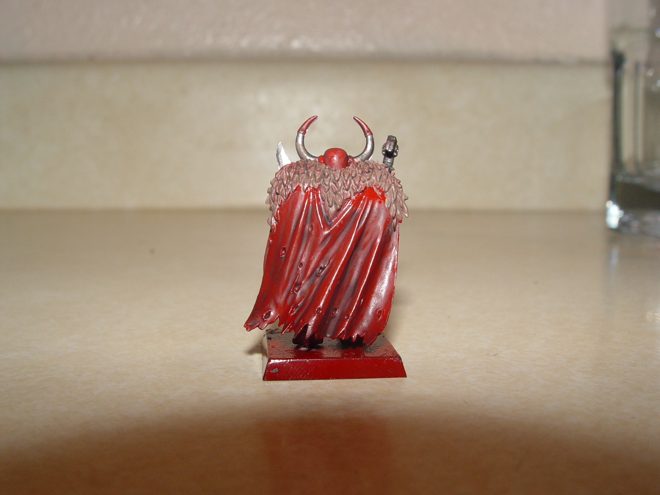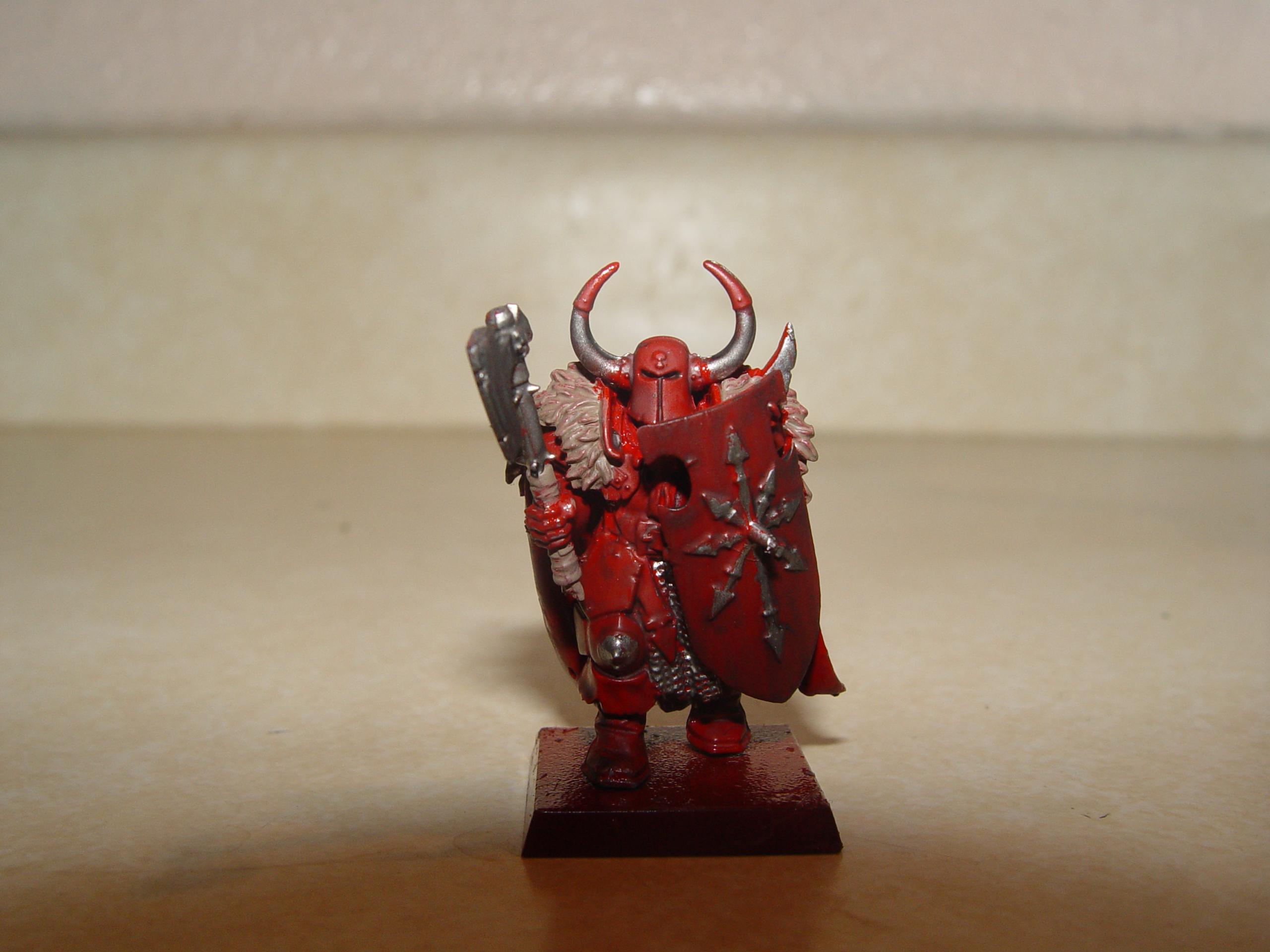 Just a quick test for painting my khorne warriors in my WoC army... What do you guys think? Im going to be stripping this guy and redoing it along with my squad after I figure out if this will look good or not but I wanted your guys opinion... I started off priming him with a red gloss primer (didnt mean to get the gloss but oh well) then did the fur khemri (i think thats the wierd looking brown foundation paint) brown, metal parts and chaos star on shield boltgun metal, did a devlan mud wash over the entire model with it a tad heavier on some spots (didnt wash the weapon however) then followed with a badab black wash on the weapon and shield... Thats how it came out... it was quick but not final... Thoughts? EDIT: GROSS! you can totally see I forgot a bunch of spots that I didnt hit with devlan mud! I even forgot the front fur! and my pics are horrible! BAHHHHH