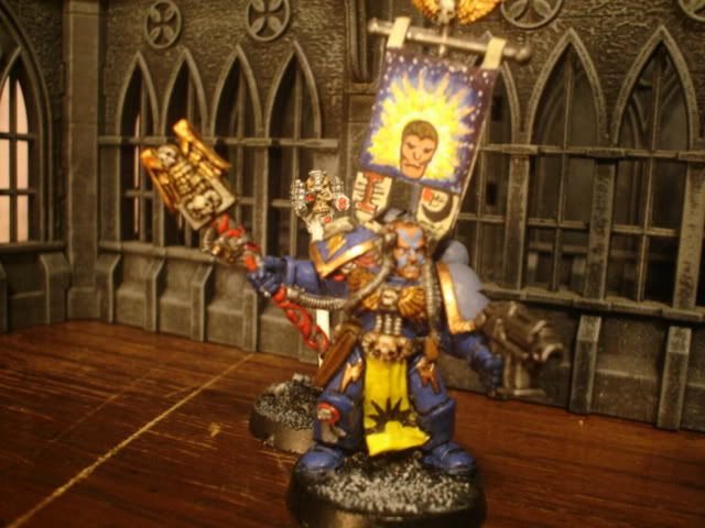 As for the size of the bagpipes for a termie, I would say larger than a bread box and ALMOST the size of a body bag for a normal human in the game. That thing was the easiest thing I have ever made. I am sure that the Imperial Fist players will be pretty pissed off with me since I used Lysander as a piper.lol