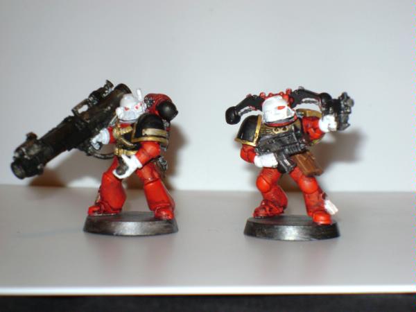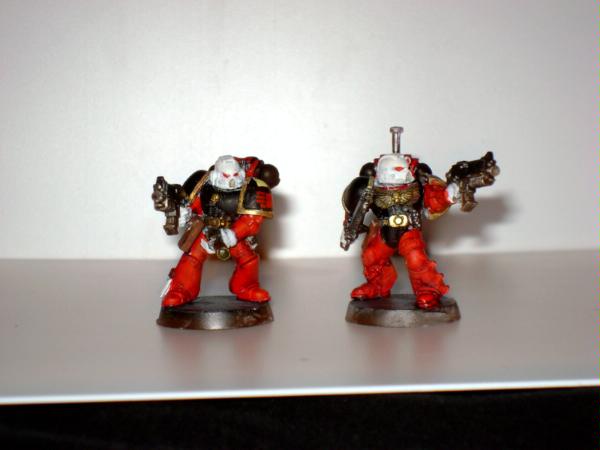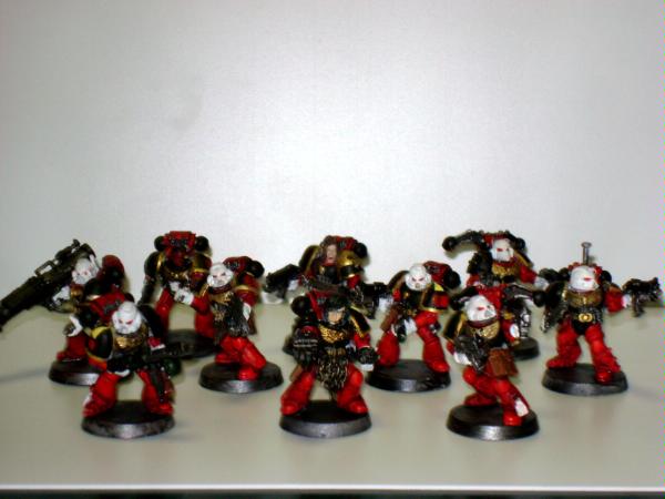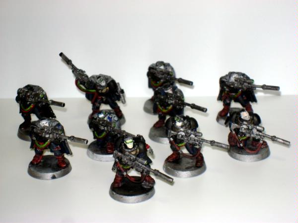 pics to follow, comments and critiques always appreciated. Automatically Appended Next Post: The first squad of first company: squad Marik. This is one of the two prized squads of Captain Tylerion's first company, "The Pathfinders". Sergeant Marik is stubborn and independent as astartes go, he is fiercely violent when provoked and his ire isn't something taken lightly by his battle brothers. His hate for xenos; particularly tyranids and orks runs deep and is readily visible. This likely has to with the duty of the first company as those sent in to make the first beachhead and secure for the rest of the chapter's strike force. Being the first ones in, they are subjected to the worst and most deadly space has to offer. Some other companies consider the Pathfinders jovial carefree attitude to be odd, but it is simply a stress management mechanism and has served him well