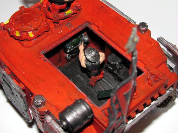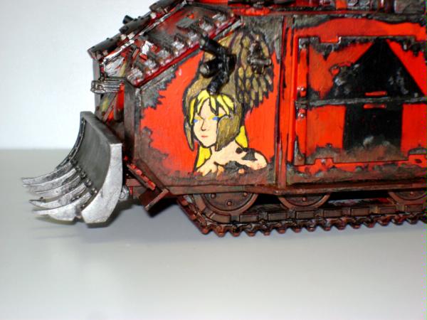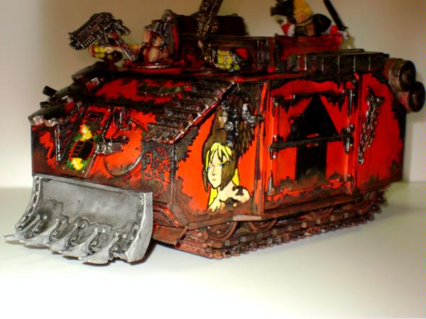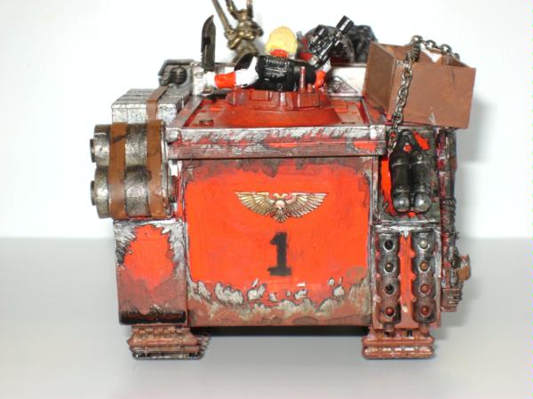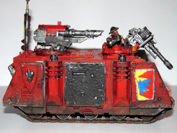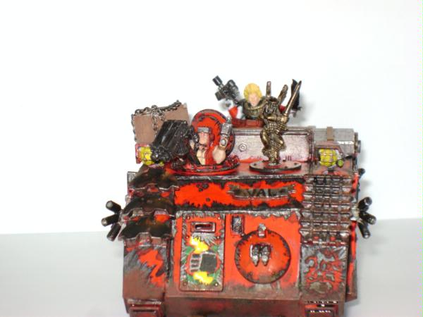 Thank you very much for the advice, it is really appreciated. For the apothecary I'm want them to have bone colored armor, but I suppose it could be a bit to dark. More fluff is soon to follow, I'm trying to spread I'm trying to spread out posts so people who are viewing can have more time put in their C&C. Automatically Appended Next Post: Here is the command Rhino/Razorback of Captain Tylerion and his command squad. It is a fitted with extra armour made from plasticard and the old metal extra armour for the smaller rhinos. It is marked iconography depicts the role of the company as well as the successes of Capt. Tylerion himself. The blue wolf symbolizes the bond between the Space wolves and themselves as a result of when Captain Tylerion rescued a pack of Space Wolves in a life pod adrift in space. The black skull symbolizes the Relictors who have a trade relationship with the Storm Brothers as a result of xeno tech given to the relictors as a sign of friendship. The maltese cross symbolizes The black templars whose century old lost crusade ship was discovered by the captain and provide a wealth of technology to build up their forces. The fleur de lye represents the twenty neophyte sisters of battle intdoctrinated in the chapter as the foundation of the 2nd company (I have the fluff for this in short story form for those who are interested). The mural if the captain's face is just one of many examples of the captain's vanity.