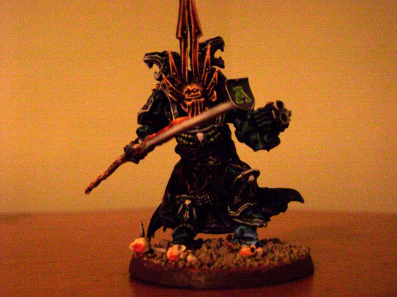 Thanks, but he wasn't supposed to look majestic. I based this on the Alpha Legion fluff I read, because this is my first conversion attempt and I wanted a Primarch. Alpharius seemed like the easiest to do. After all, he was supposed to be one of the smaller Primarchs, and was fond of using doubles. I hardly think that doubles could be particularly effective unless he wasn't a particularly conspicuous presence among his troopers. Also, it's much easier to impersonate someone if they wear an enormous helmet all the time than if their face is showing, correct? More to the point, I tried doing a face but sucked horribly at it. I did think that the helmet he's stepping on is a nice touch, though.