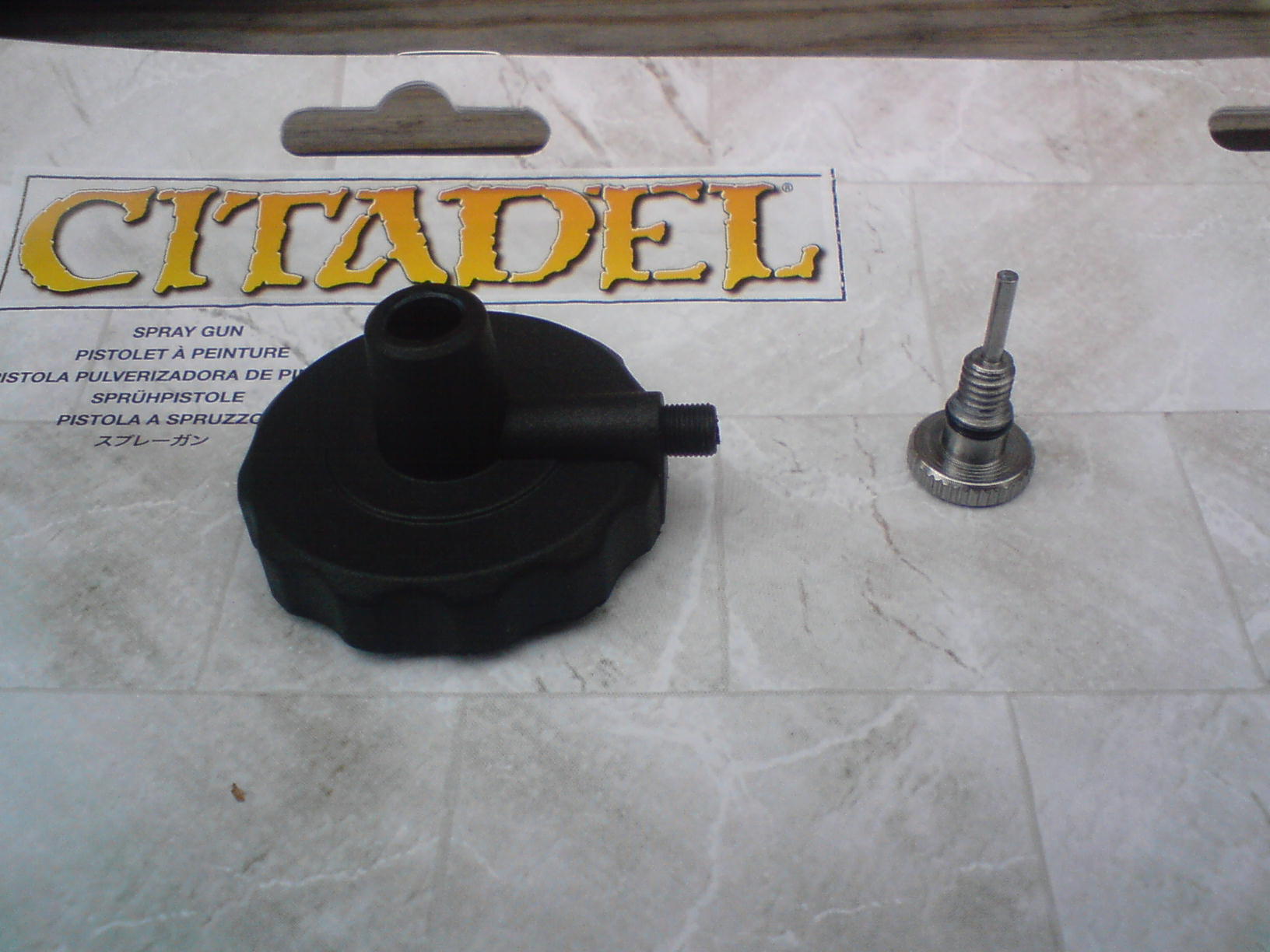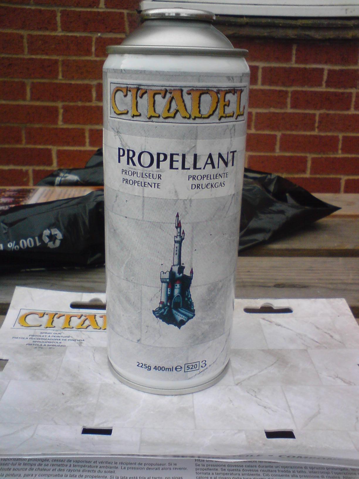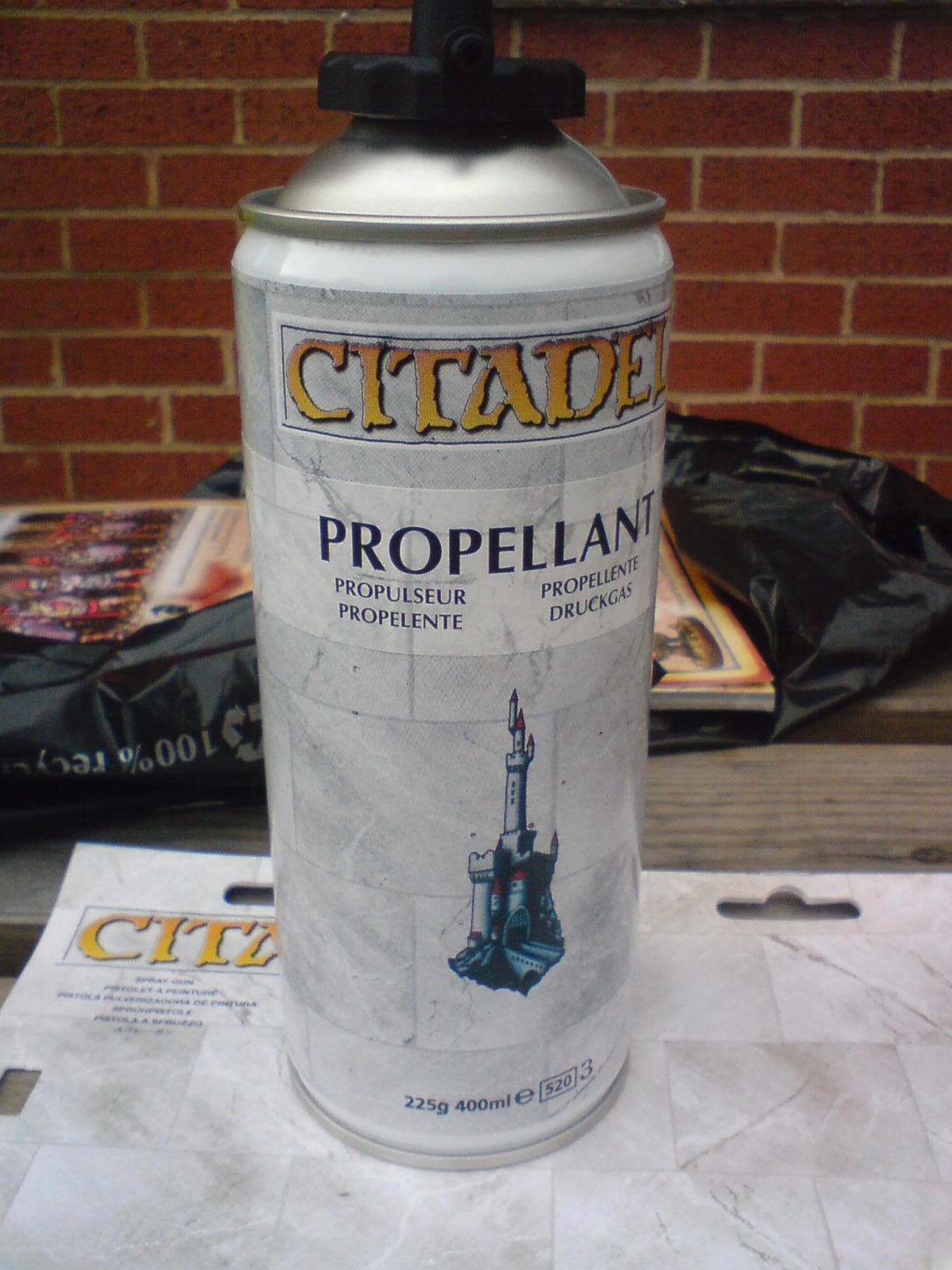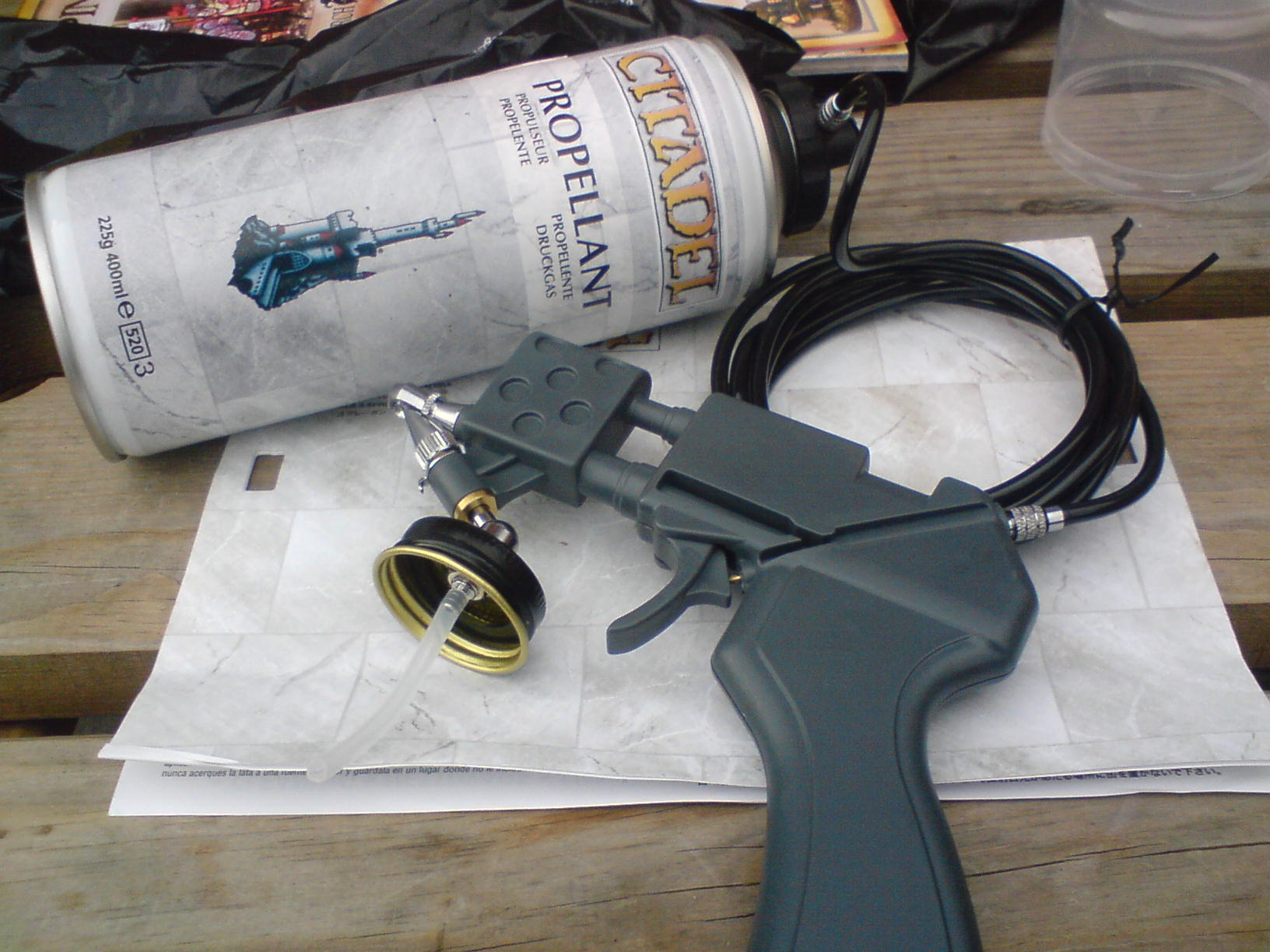 My review of the Gw paint gun..... The first three pics are of the separete parts and the next three of assembly, the last three are of the paint pot ready to go, the first test and how much a paint pot gets you. The air proppellent has a removable screw valve that allows you to disconnect it all. Paint ratio on my test was 1:4 although GW pot guidelines say 2:1 water to paint. I reccomend you clean it as the small components are easily clogged. Overall it works well and has a good fan pattern with few splatters, Along with advantages over spray cans in that that you can change colours easily, and a more focused spray area. But because of the proppellent cost being almost the same as a spray can and GW paint being nearly £2.50 GBP you might as well get a proffesional airbrush with compressor or standerd spray paint, the only way it makes sense is if viewed as a "halfway point" between spray can and airbrush.