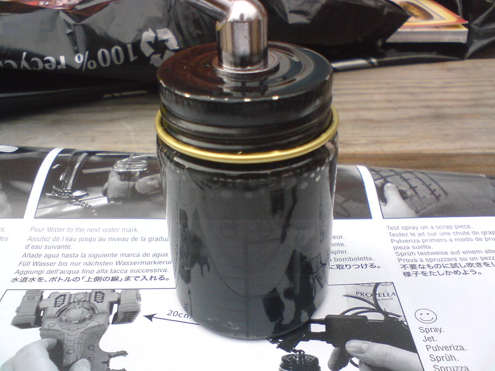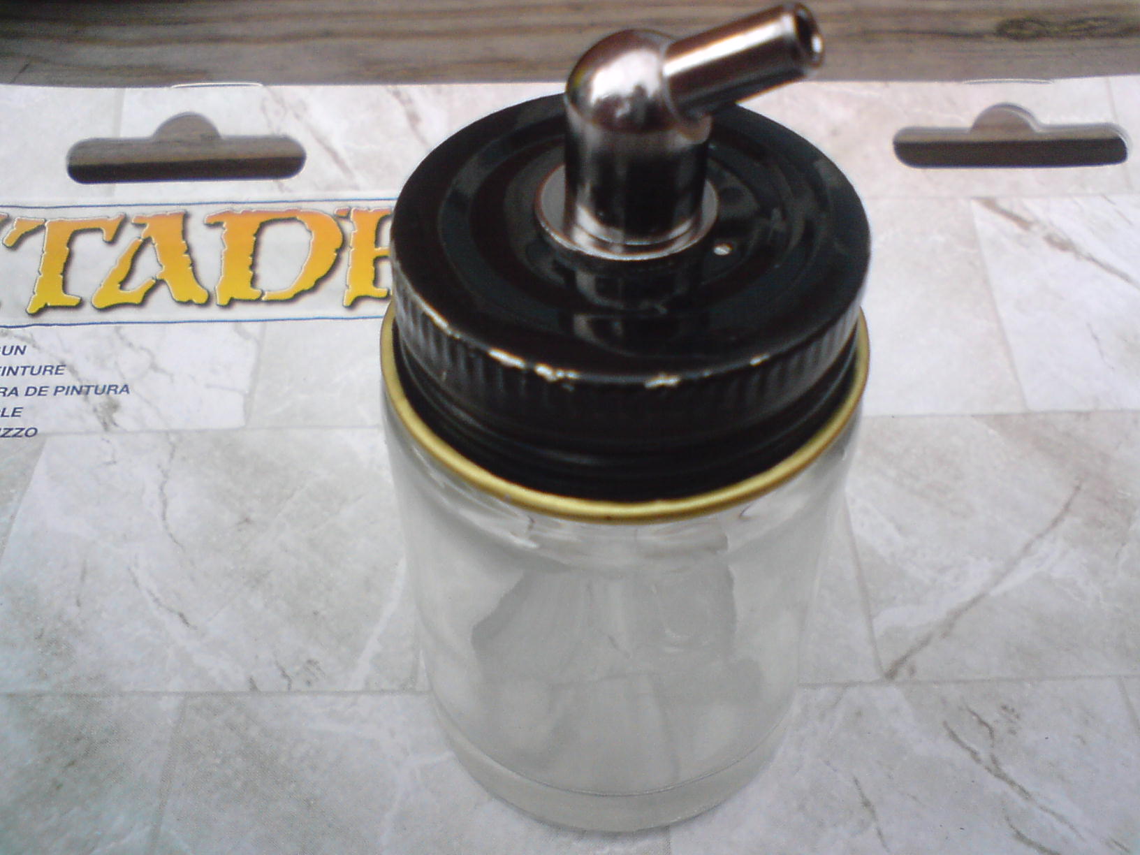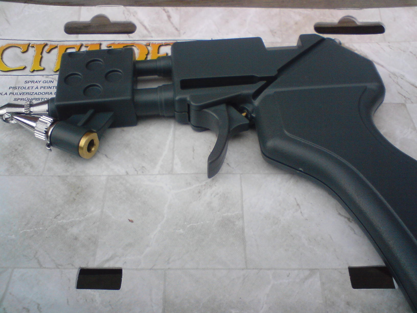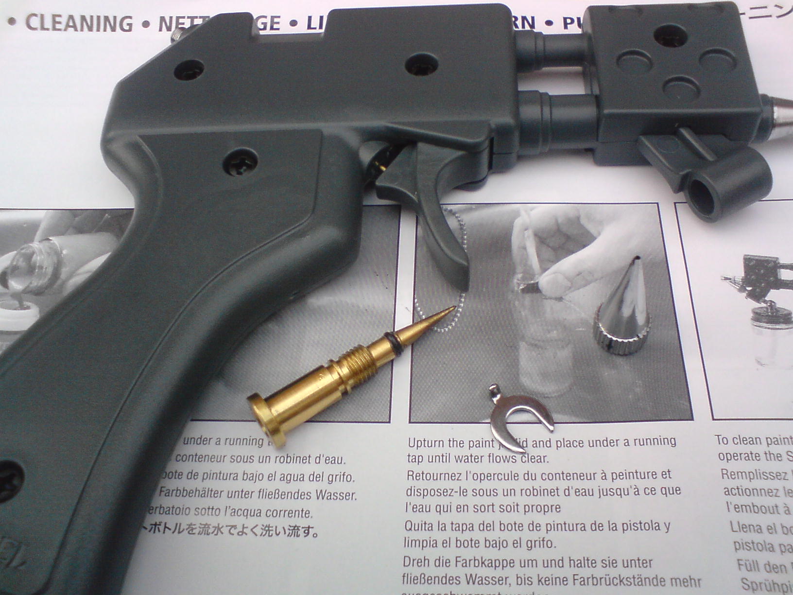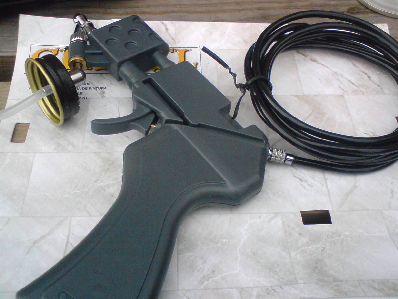 My review of the Gw paint gun..... The first three pics are of the separete parts and the next three of assembly, the last three are of the paint pot ready to go, the first test and how much a paint pot gets you. The air proppellent has a removable screw valve that allows you to disconnect it all. Paint ratio on my test was 1:4 although GW pot guidelines say 2:1 water to paint. I reccomend you clean it as the small components are easily clogged. Overall it works well and has a good fan pattern with few splatters, Along with advantages over spray cans in that that you can change colours easily, and a more focused spray area. But because of the proppellent cost being almost the same as a spray can and GW paint being nearly £2.50 GBP you might as well get a proffesional airbrush with compressor or standerd spray paint, the only way it makes sense is if viewed as a "halfway point" between spray can and airbrush.
