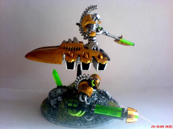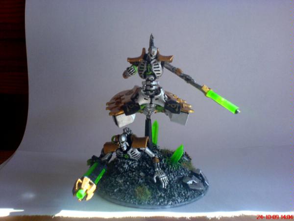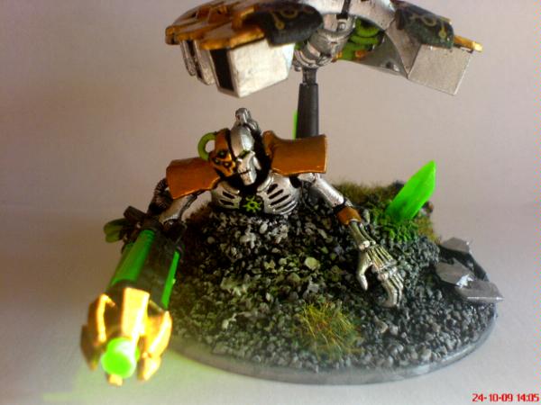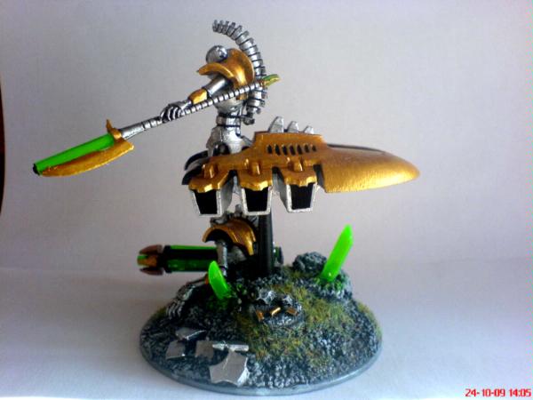 I really like the stark Silver/Gold colors you got going there. The green plastic crystals on the base is something I've also wanted to do if I ever get around to basing my guys (unlikely). The Necron coming out of the ground is cool, but I think you should have chosen a more disposable one like a Warrior, rather than a Destroyer with a fully ready gun.
