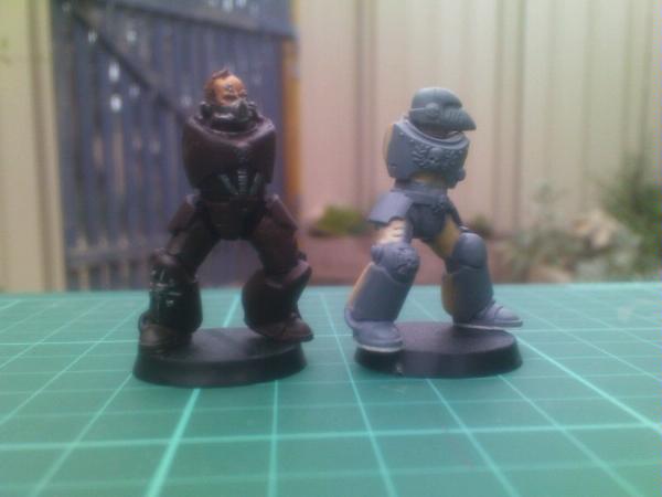 Hey all Started working on a new custom chapter of the emperor's finest  ALL of the units will be TrueScaled so I'm aiming for a small-ish army. Going with a desert world theme for my chapter. Putting some early Wip shots of some Command Squad guys up for C&C, one guy I've just started painting, the other I'm still working on, with a guardsman for scale reference. At the moment I have enough bits for a Command Squad, Captain and a Librarian. So let me know what you think