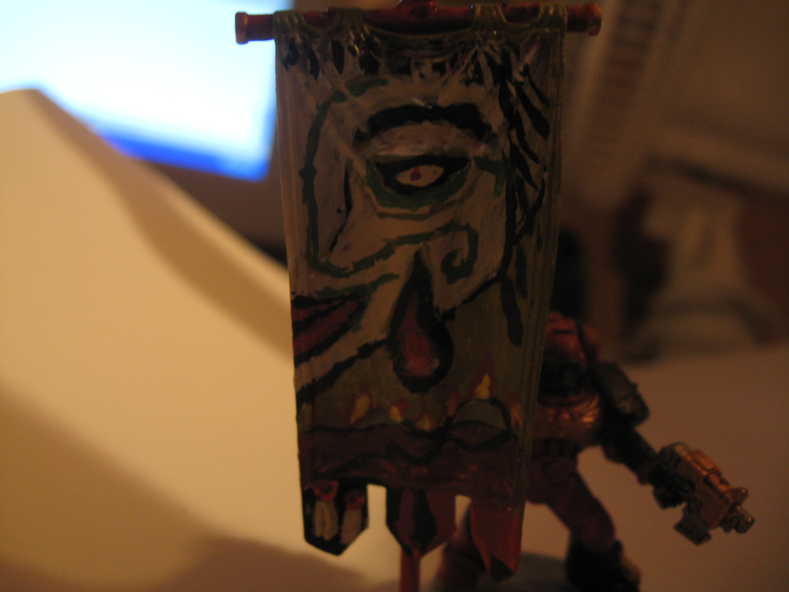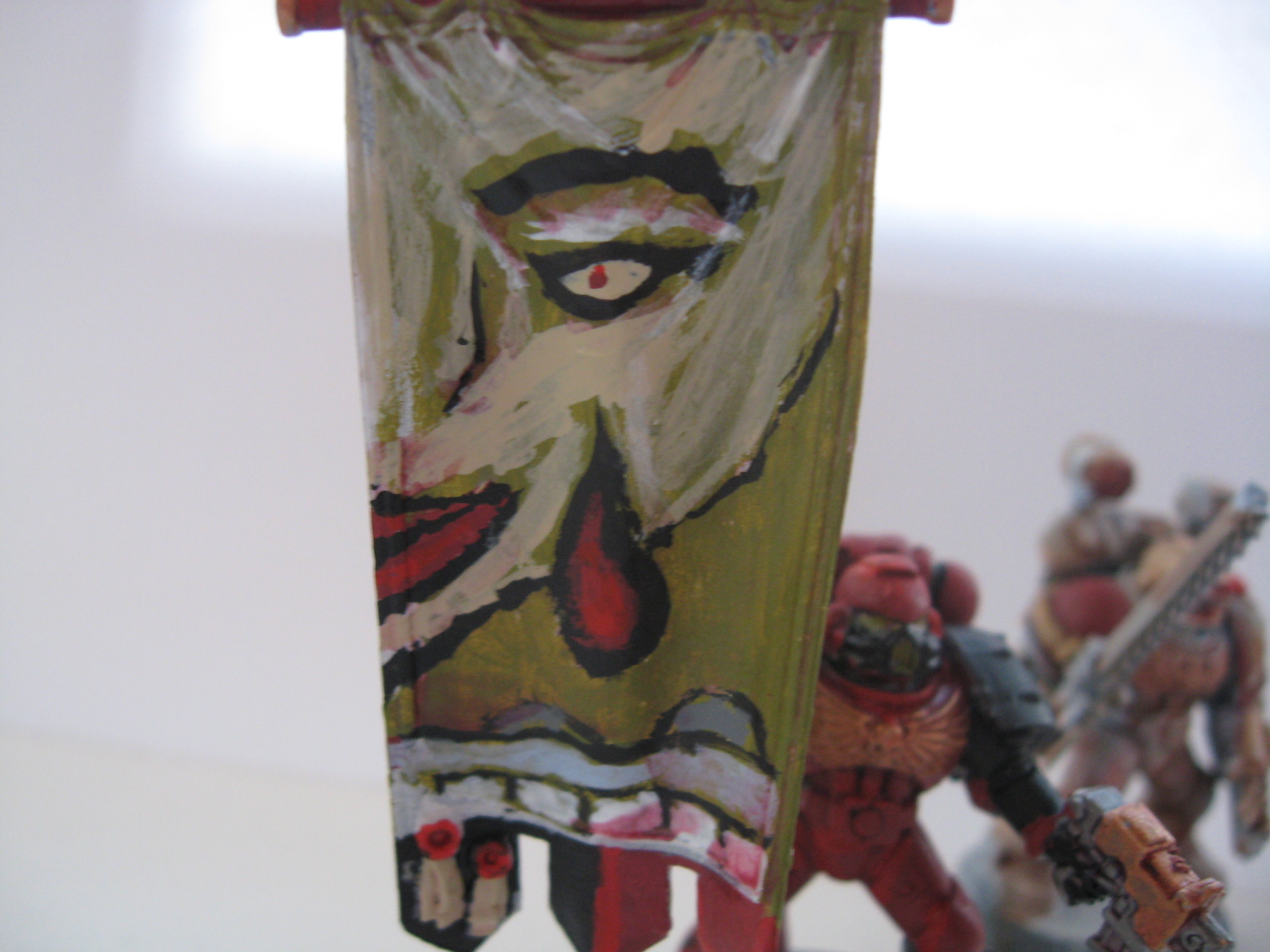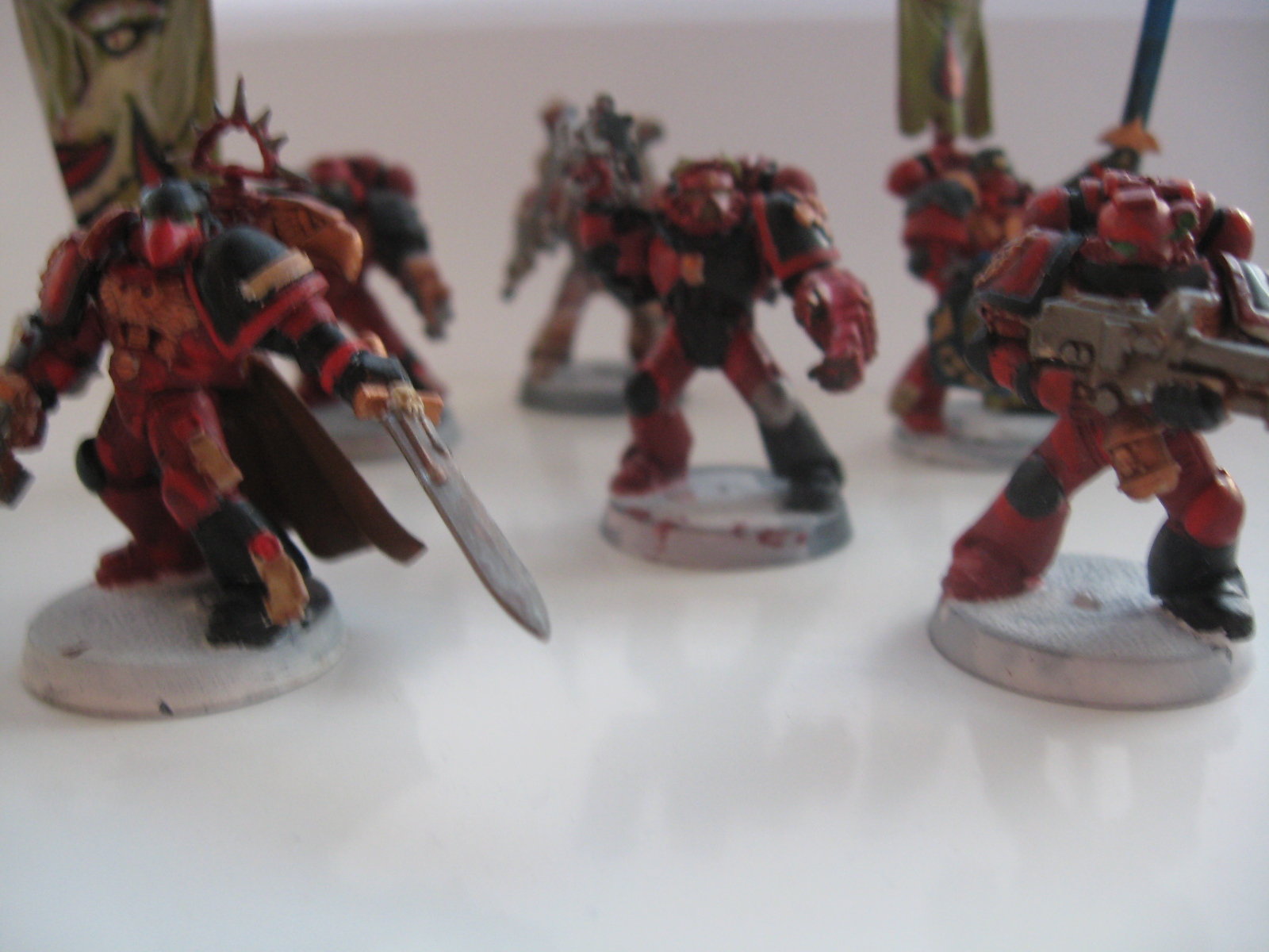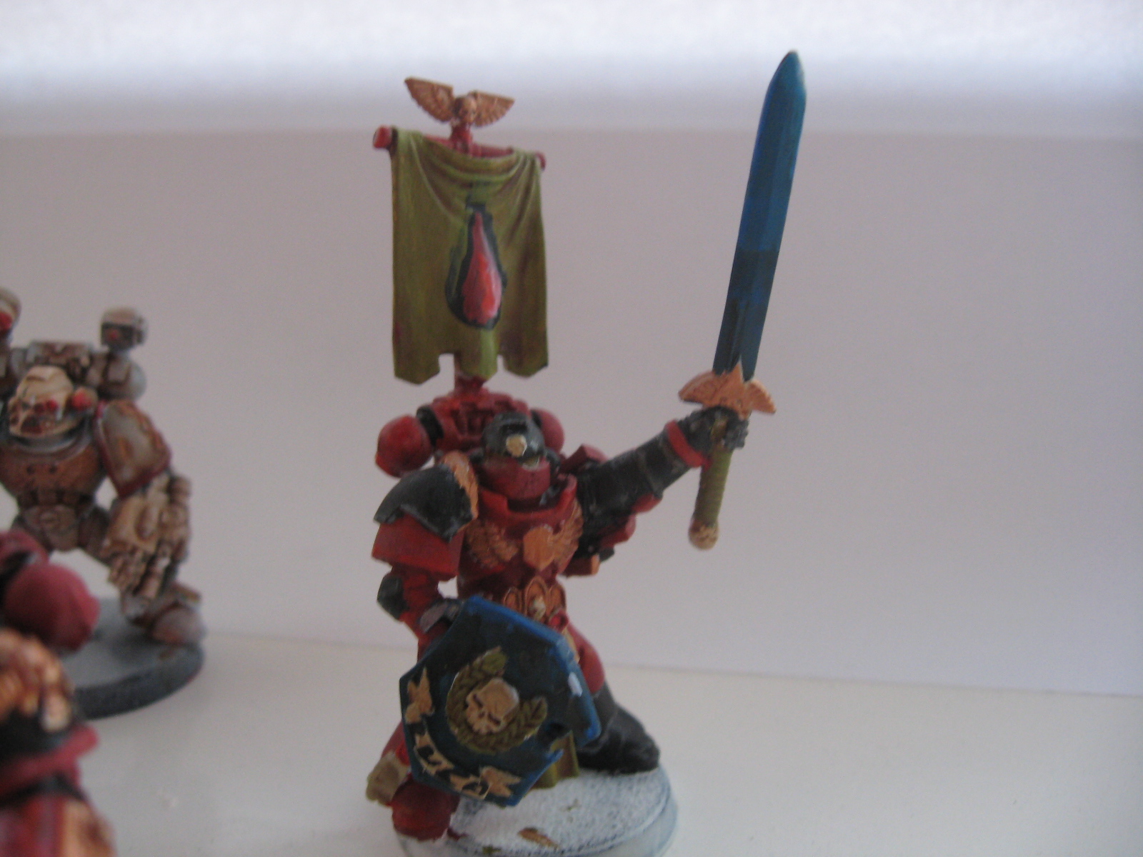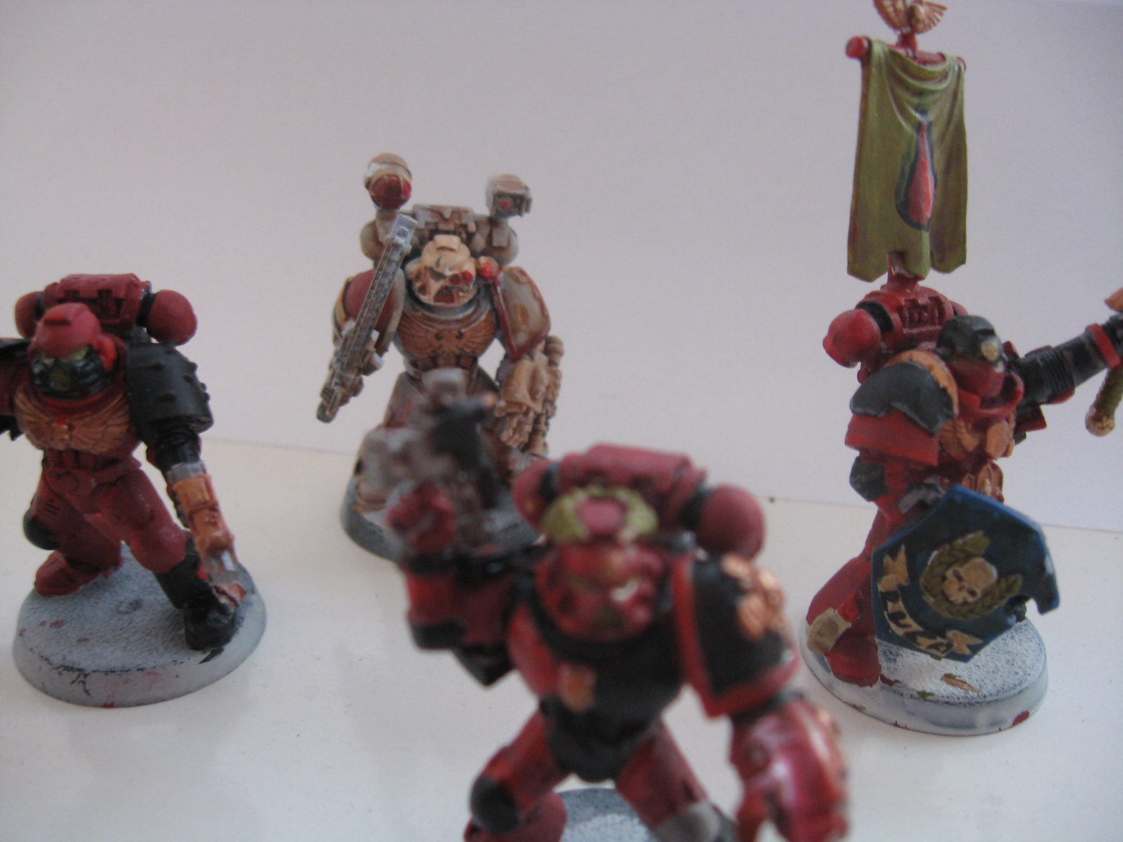 So I finally finished my command squad, I'm quite pleased with how this stuff turned out especially the banner, never tried freehand before, but LittleBoyBlues inspired me to have a go. It looks kind of rough and some of the colours look really bright, but there more subtle shades in real life. It is supposed to depict a Pre-Imperial legend of the Blood-Brothers homeworld, The Earth-godess saw the featureless land and wept for her lost children, a single tear of blood, which created life so on so forth. The Champion was my first ever go at blendiing on the sword its not great but since then I think I have refined the technique a bit more on other models. The Apothecary really had me stumped at one stage, but I decided white was simply too bright so its a space wolf grey heavily washed. Hope you guy's like it.