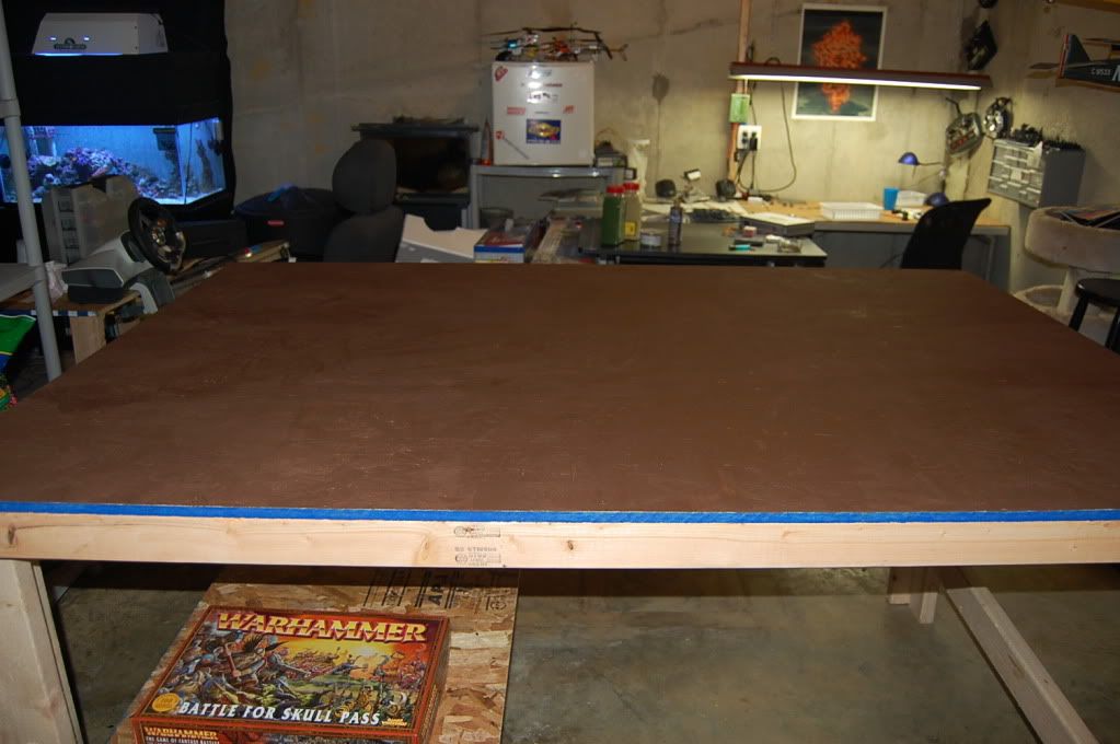 Looks like a great start. I like your ground cover painting. This will look really nice when you have terrain on it. How much does this thing weigh? It's a fair amount of wood. With the concrete floor, though, it looks like it can still be moved around easy enough.