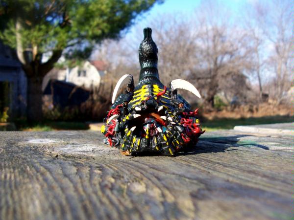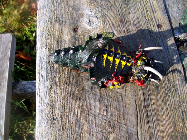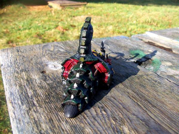 Hey folks - thought I'd share this model - Back in the glory days of ebay, I scored a bunch of tyranid odds and ends, and to my surprise, found an old Armorcast Malefactor, minus arms, in it. I always liked the malefactor, and have never liked the shooty Carnifexes (to me, tyranids are all about the stabby claws - Ok, maybe hive tyrants and warriors are smart enough to use and care for a bio gun, but a Carnfifex?) So I've converted it into some kind of bile launching and spore mine launching tyranid beast The holes where the arms went were covered by the infestation Markers from the Battle for Macraig set, and the mouth is from the same set, with sculpty tendrils and scything tallons from something or other (metal). I figure it spits out the mouth.