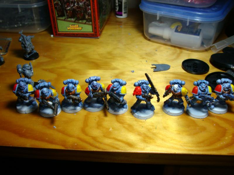 More added - first painted squad of Grey Hunters - these are just resprays from Ebay, so they are not the best quality to begin with, but as a testing regime, its not so bad. If anyone has any quick tips for improvement (as opposed to 30 stage processes involving using the cycle of the moons gravitational pull to maximize brush stroke effectiveness) let me know. These have just been sprayed white, hit with 60/60 Shadow and Space Wolf Grey twice, washed with Asurman Blue and then rehighlighted/drybrushed with pure SW Grey. The shoulder pads are such an assortment, I've just painted right over the symbols for the most part - I may throw a wash and highlight in to bring them into relief. [edit] Having tried further to enjoy painting this scheme, I have failed. I think I will go with a cross between a shadow grey and a foundation grey in color. I have moved all of the TH/ SS images from shown here to only in the gallery. Otherwise this project log will take up 50 pages. Will have them all up soon! Now some blurry shots of part of the force - more to come .;