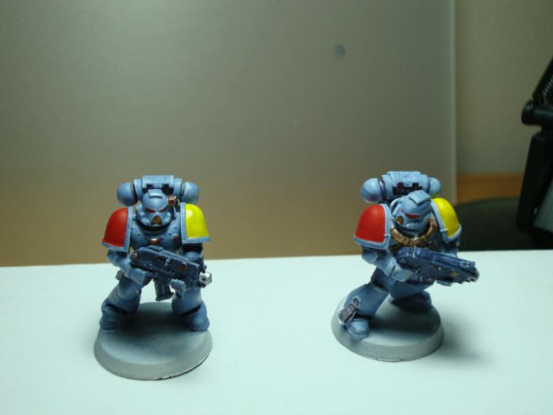 Here is the first two painted Grey Hunters - these are resprays from an ebay win to test the scheme - working off of a white basecoat. I think I might go for a darker scheme with a black undercoat - but thats why we have test models, right?