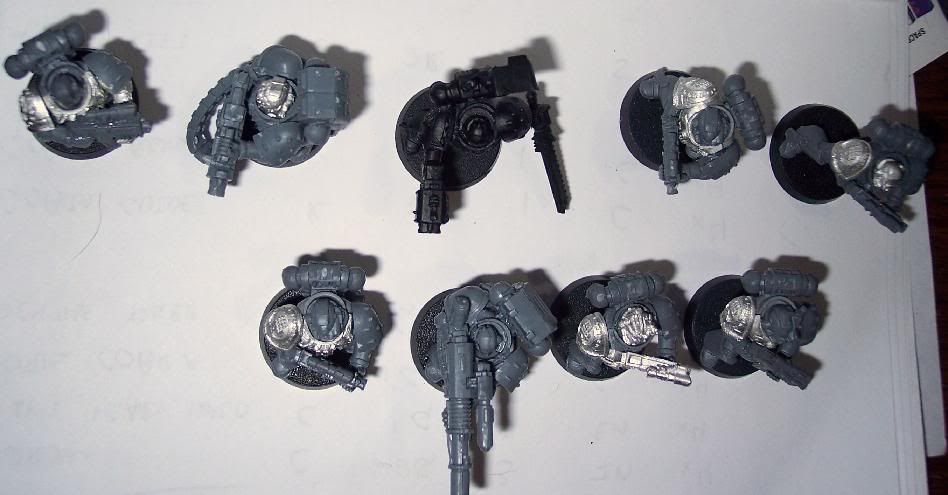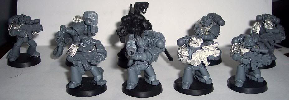 Head: Bionic - Iron Hands or Plastic Torso: Iron Hands or MK8 Arms: 1 Iron Hands and 1 Normal or Heavy Weapon Legs: Iron Hands or MK6 - Standing, Walking or Kneeling Backpack: Devastator for Sgts and Large Skull for Non-Sgts Bolters: All will have scopes