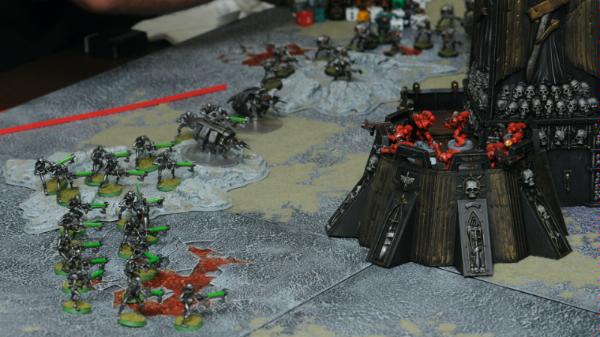 Also, the one big terrain piece in the center of the board really favors jump troops and skimmers, which neither of us had. Going all the way around the thing is really time consuming. The Immortals squad was really taken out of the game by having to walk all the way around the long way. Also my Terminators deepstrike into the battle, while everyone else walks on behind the fortress, leading to the Necrons having only one thing to shoot at...