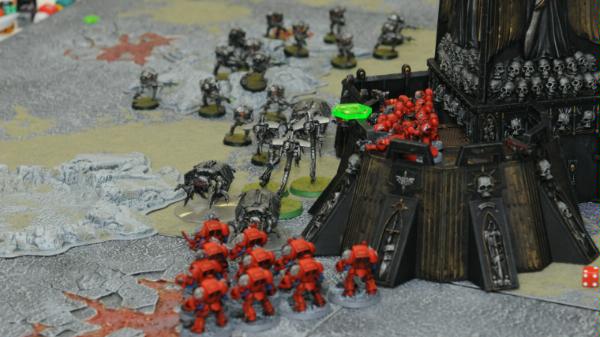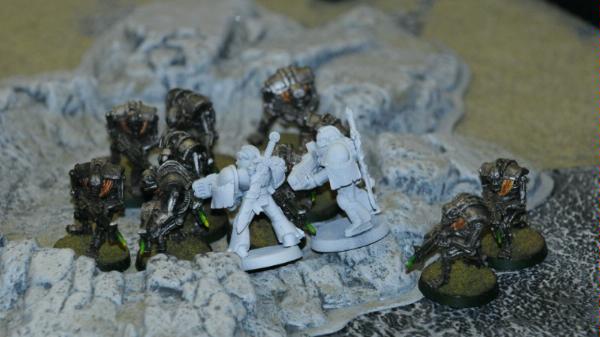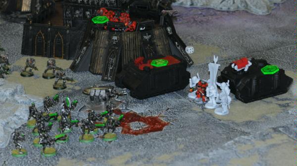 I have a tactical squad get out of the rhino in front of the necron firing squads...I don't know why, but the dread and scouts kept plugging away while the Command Squad got into range of doing something useful.