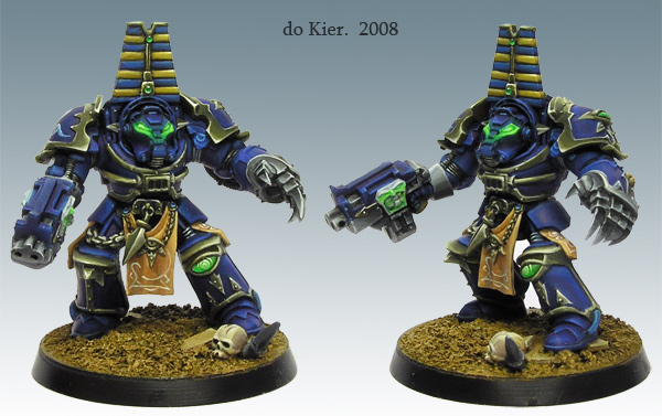 I've never cared for this conversion. The headdress belongs on the head after all. If GW/FW was to make 1ksons Termies, I'd be they'd come up with a more novel design than this. The paint job is excellent though and I don't think for a second that the eyes have been photoshopped.