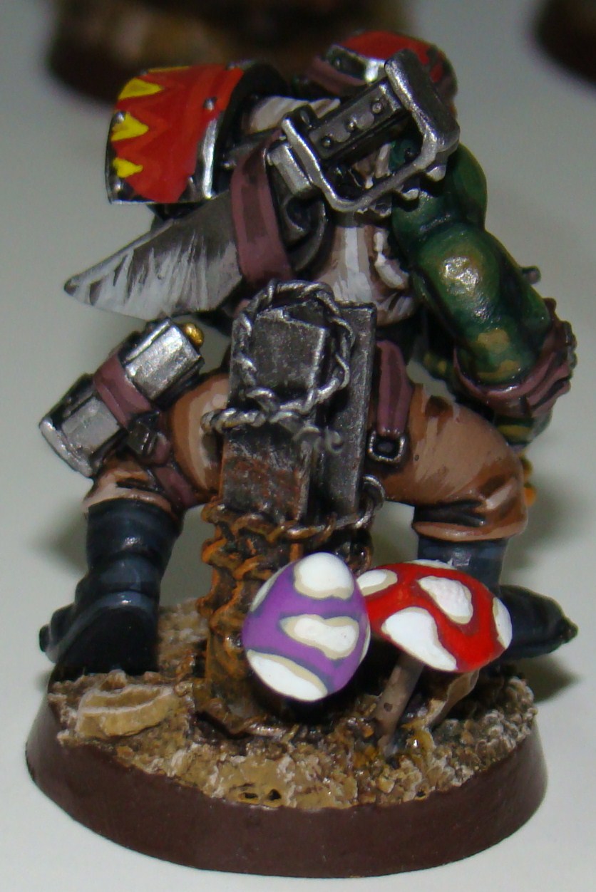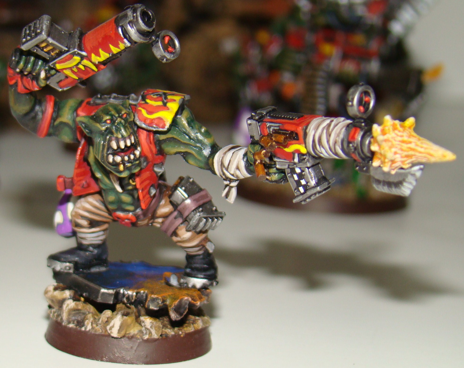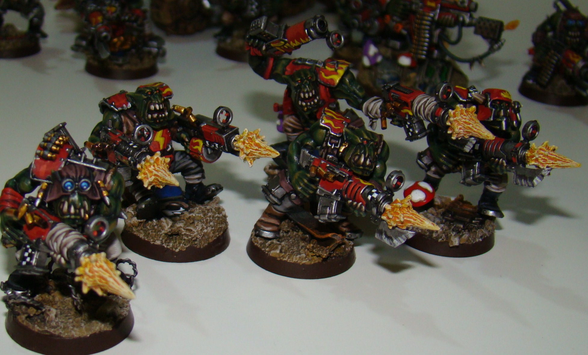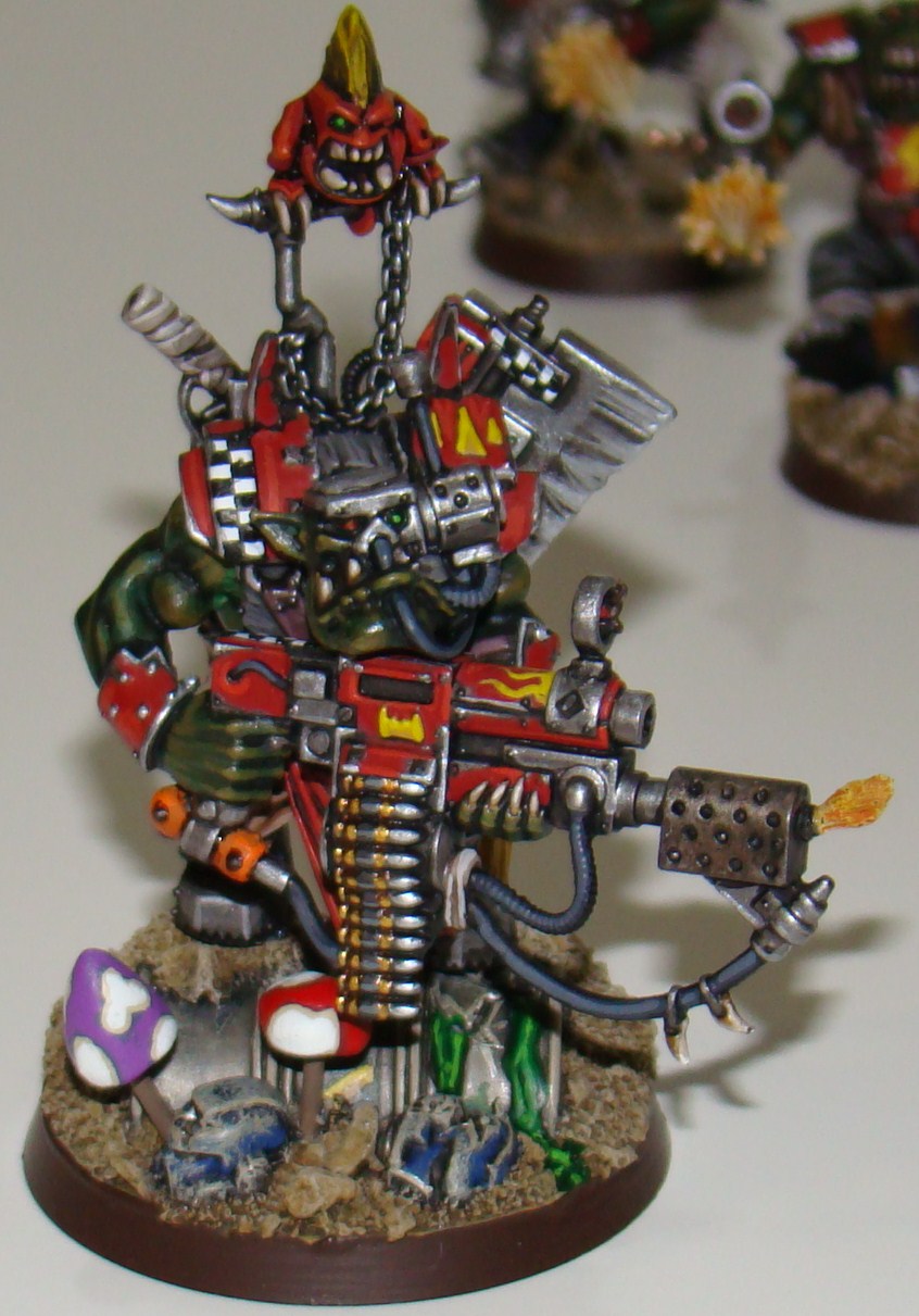 I'm a firm believer in WISIWIG, so all my Shoota boys have spare ammo mags with a green stuff strap holding it in place. Most have secondary weapons. I've detailed the bases with bits of SM Tanks and stuff, adding mushrooms and reeds where appropriate. The Gun discharges are from the Cinematic effects range from Amourcast. If the Shoots has a muzzle flash, I've modelled casings being ejected fom the Shoota.