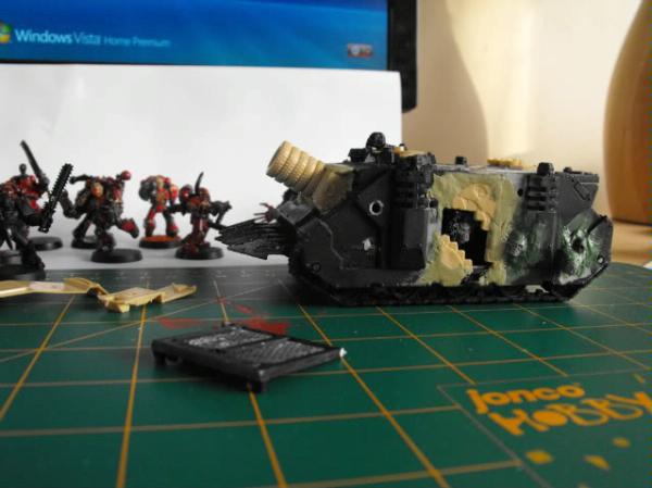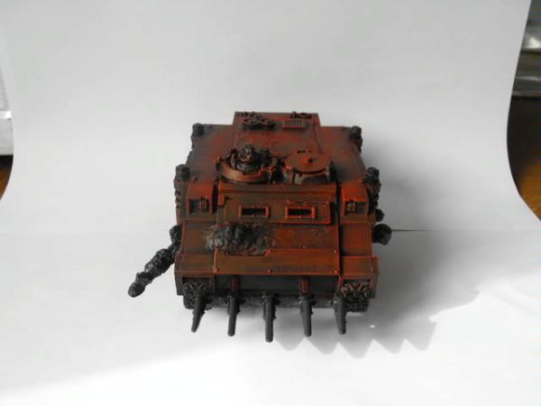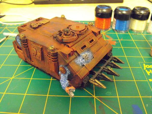 Here's some shots of the paint WIP so far the rhino has been undercoated with chaos black spray paint from GW, then using the biggest brush I've got I drybrushed it with GW blood red.....