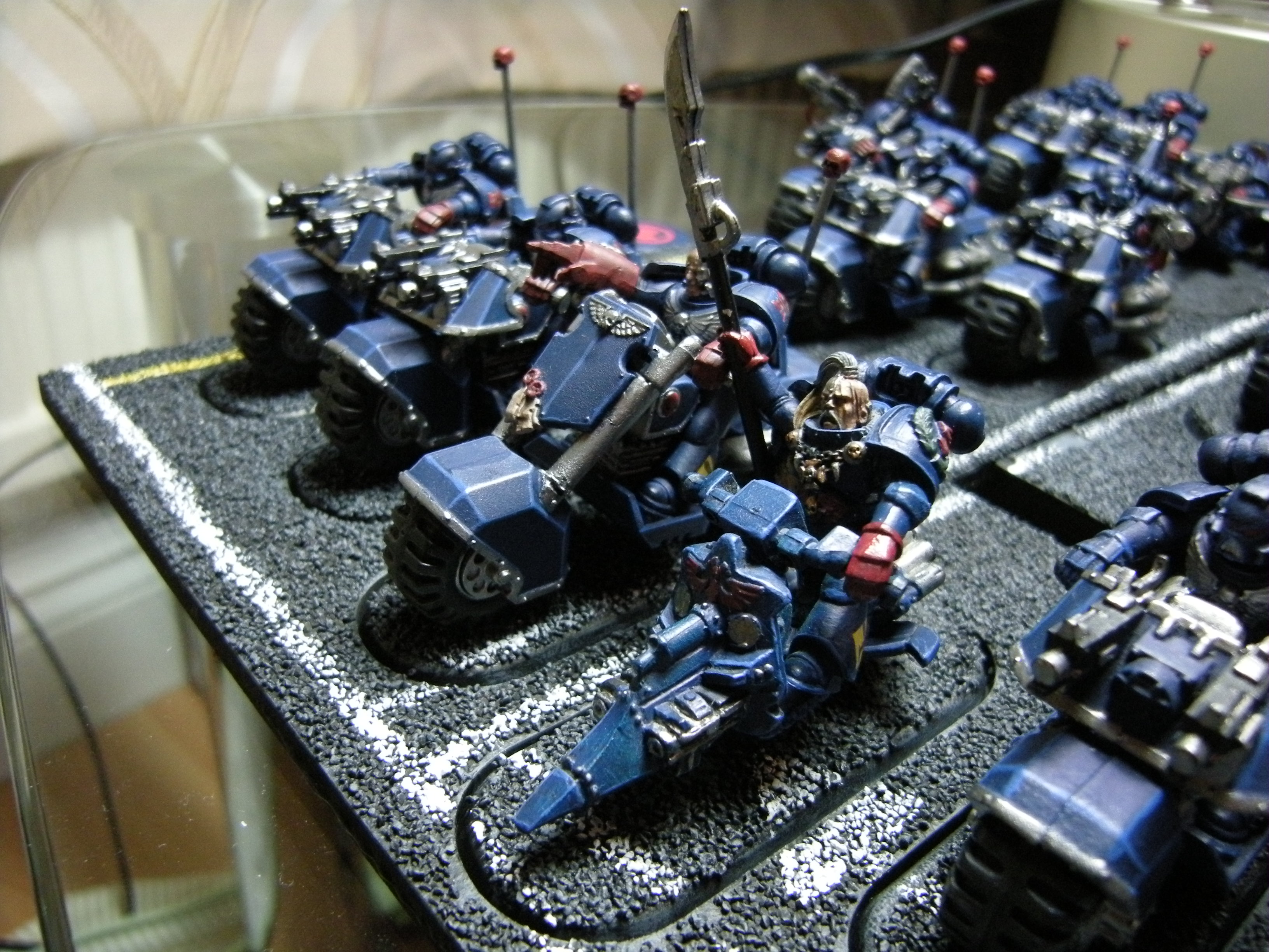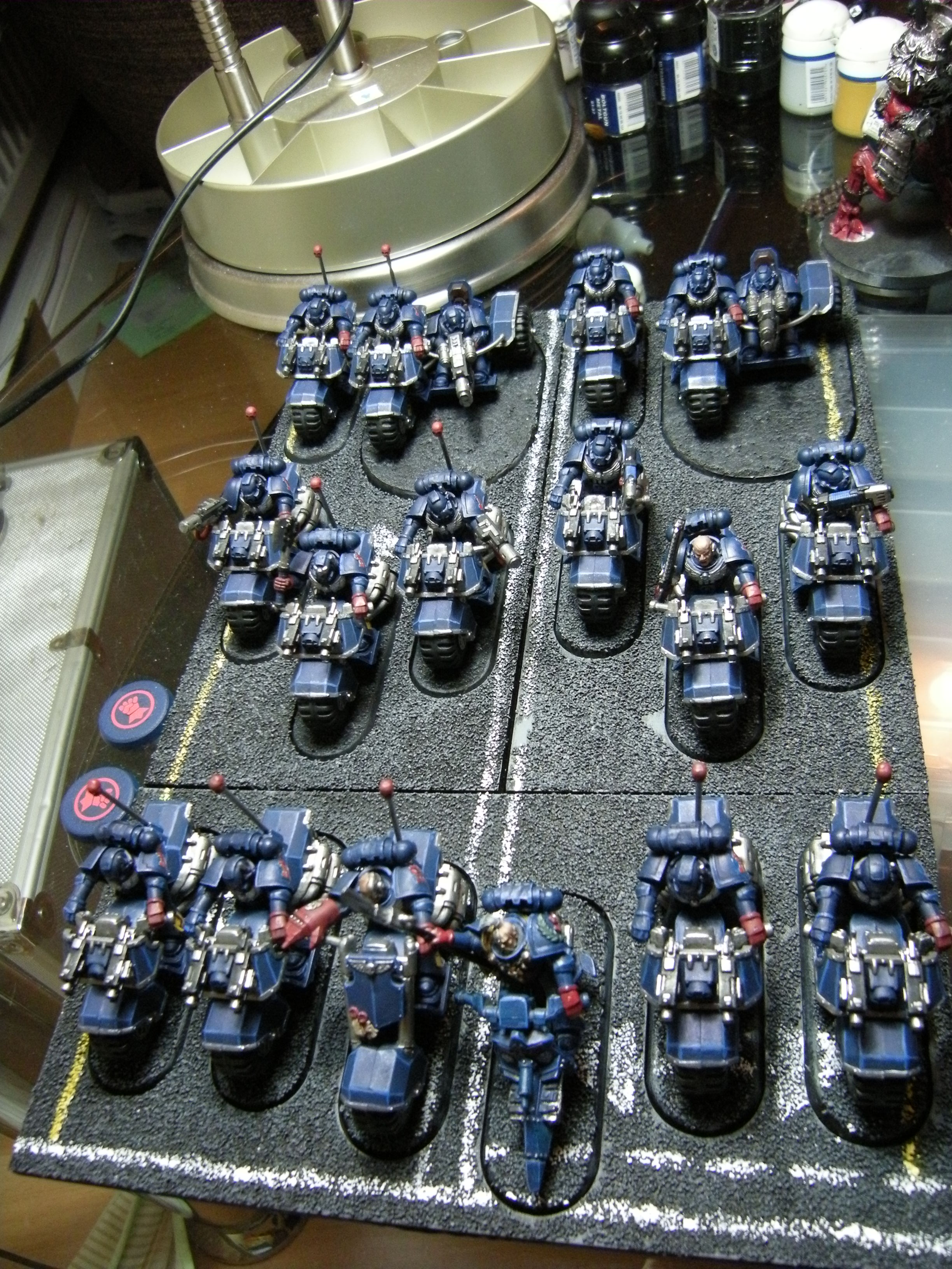 And below are the obligatory pics. The leg markings are part of the fluff for the overall doubles army. The Crimson fists and blood angels were conscripted by Inquisitor Dexter Cruris(i know the latin translation is Right Leg, there is a RL reason, but also explains the army markings). This is his force. The movement trays were custom made for me by www.warbases.co.