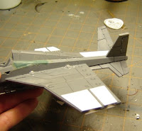 The last step is to add your tail fins. They attach just like normal although they are upside down from the placement on the Valkyrie. Now its best to let the whole thing dry for awhile. So find some way to suspend it with the weight on the wings. This way they should dry straight and it also won't interfere with the drying of the lower fins and engine.