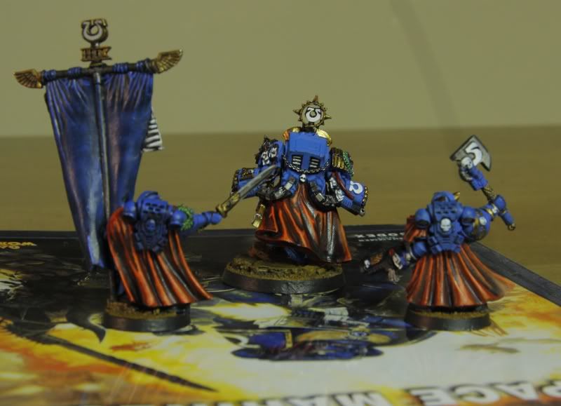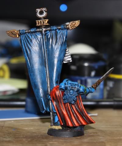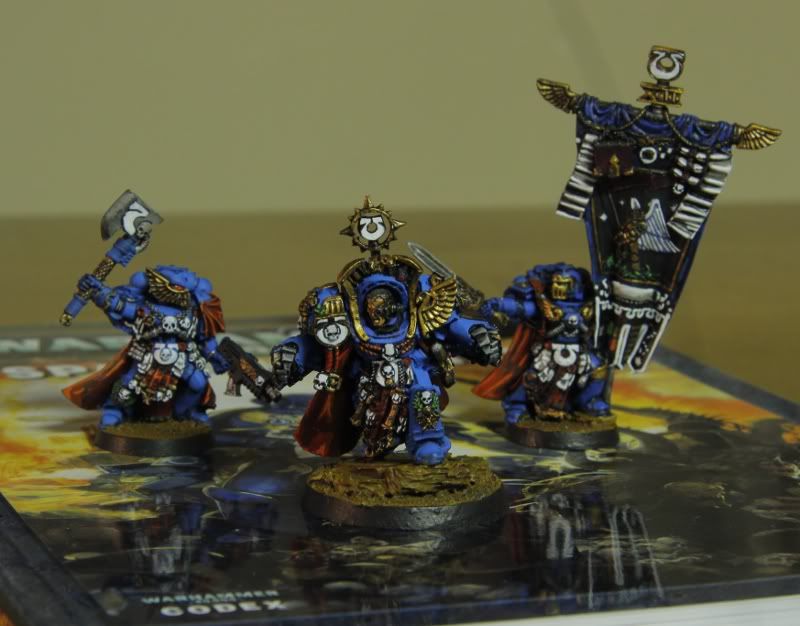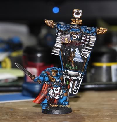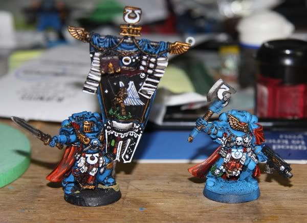 It totally kills off the airbrushed highlighting here: which is why I'm having trouble with the debate on washing the marine on the right to match more the one on the left. But then I'm right back to square one on time for marine paint; though in the last 4 hours I managed to airbrush and highlight the blue on 10x assault marines, 25x tactical marines, 6x bikes, 2x attack bikes, 1x marneous, 7x honor guard, and 6x scout marines... plus finish the one honor guard marine.
