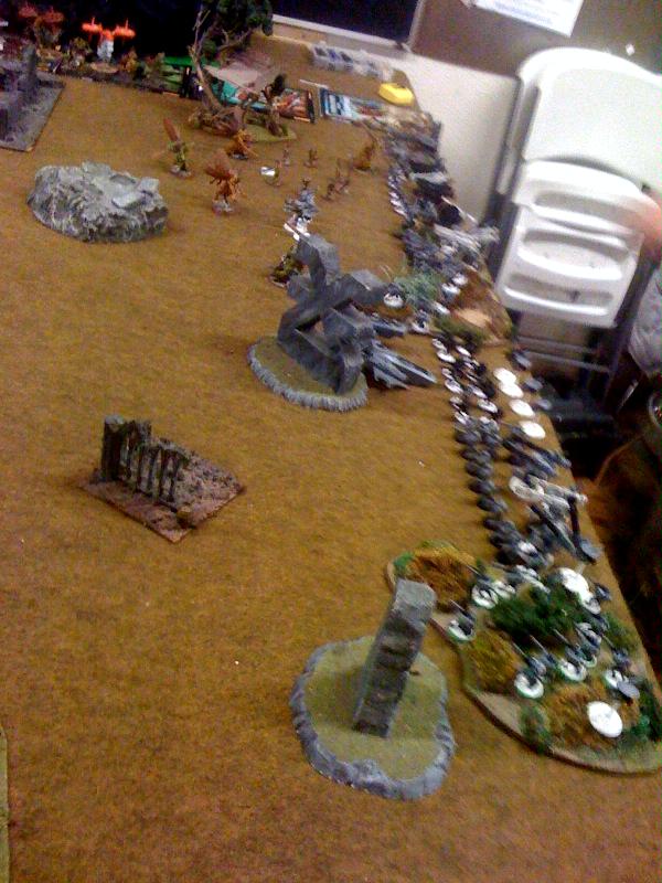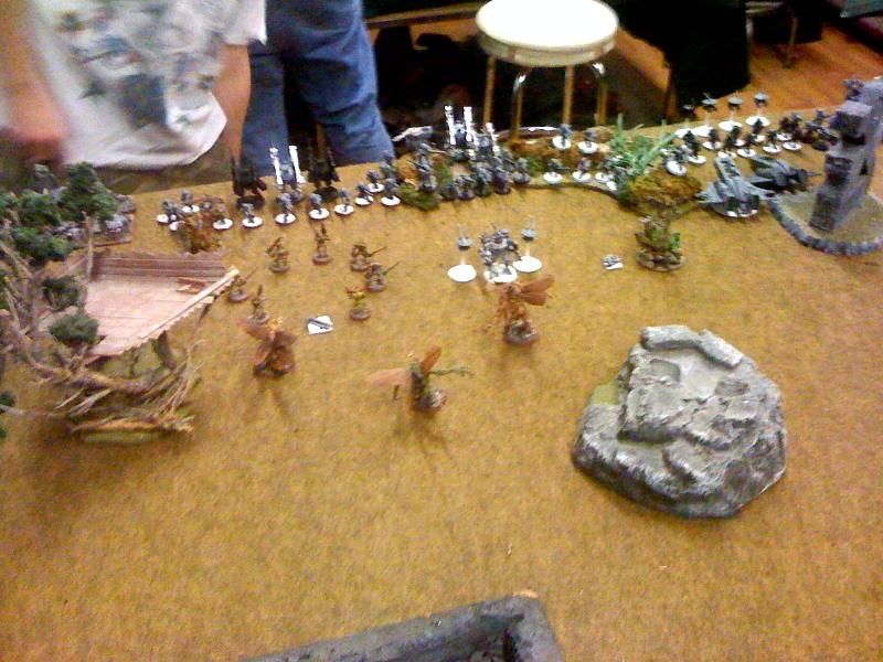 sms shots puts it up to 10.5 wounds. Now if we take those same numbers and apply them to the daemon prince's we get 14.5 wounds, or with his deployment 12.4 wounds (assuming I had no cover). So by deploying in depth that means he should have been able to kill off all 3 daemon princes the turn they dropped. His commander I would have charged into a unit of plague bearers to just lock them down. On the daemon turn I would then have assaulted 2 units of fire warriors (with 2 great unclean ones). Then depending on what got locked in combat he would have his targets for the next round. I'm not saying that would have won him the game but it would have made it a lot closer. Because then it's my 2 great unclean ones plus whatever I managed to get in on my reserves vs. his 48 fire warriors and 9 broadsides.