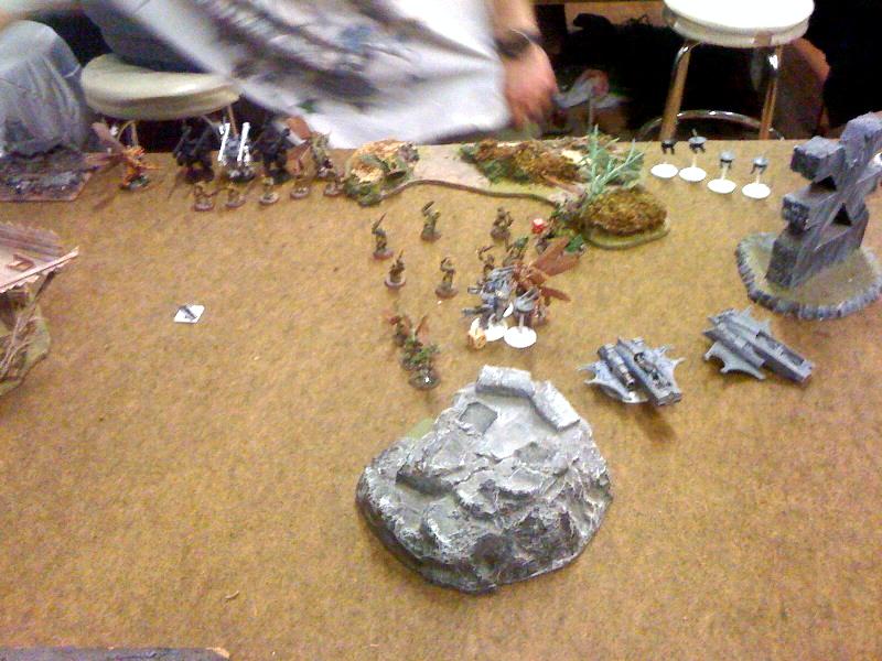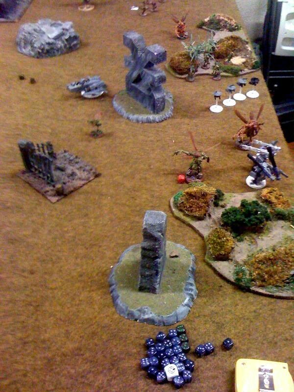 The broadsides down the blight drone that shot up the warriors, he takes some strength 5 shots at the wounded daemon prince, but is unable to get the last wound on him.
