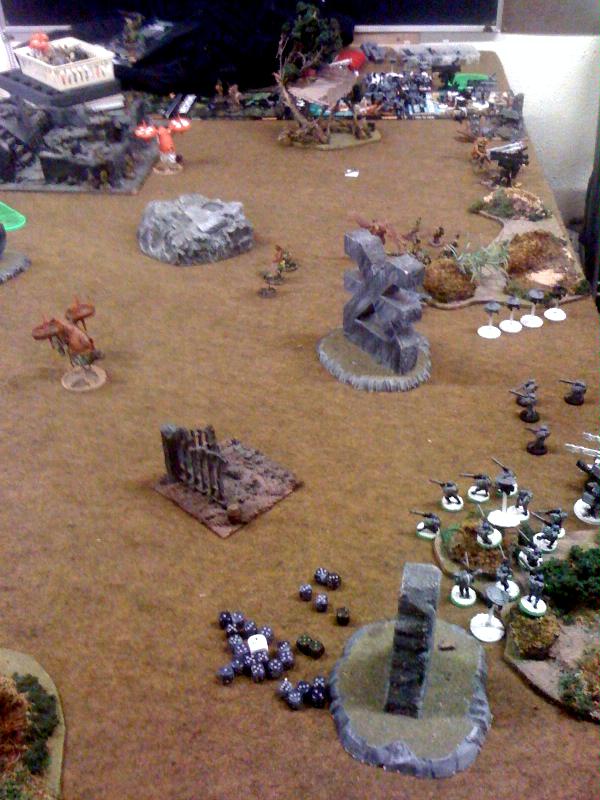 This is the end of turn pic after I've deployed. But I don't have any shooting in my first wave. The objectives are on the 2 white square bases the third is in the upper left corner of the picture in the grey building.
