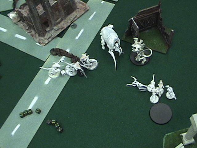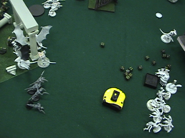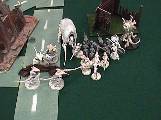 Turn 4. his hive tyrant finishes the lone gant that was holding him . The big scum in the middle ends with my Prime and 2 warriors and tervagon beaten down to two wounds, andmy 5 guants in combat with his tervagon. The parasite and the Flying warriors bone swords do thier dirty work and gants die in droves, the wined warriors and the parasite consolidate into his objective, the game is mines.