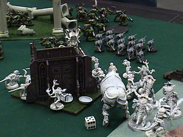 Turn two. The rest of my army comes on. and I spawn another 15 gants! combined fire takes The tyrant down to two wounds, I miscast FnP and take a wound I end my turn