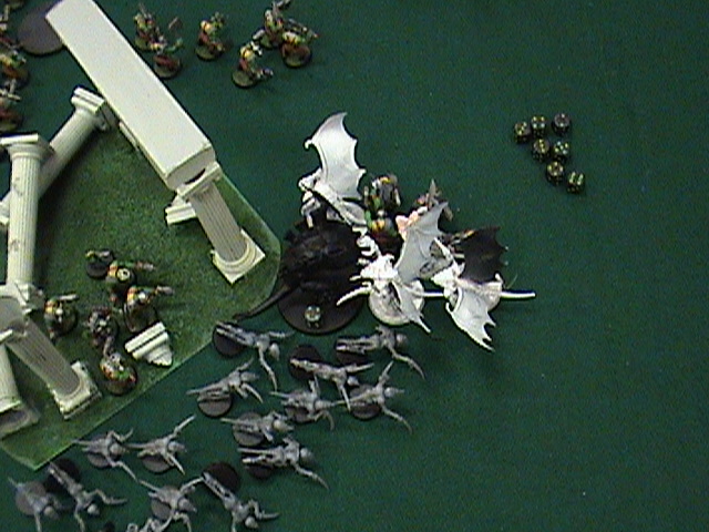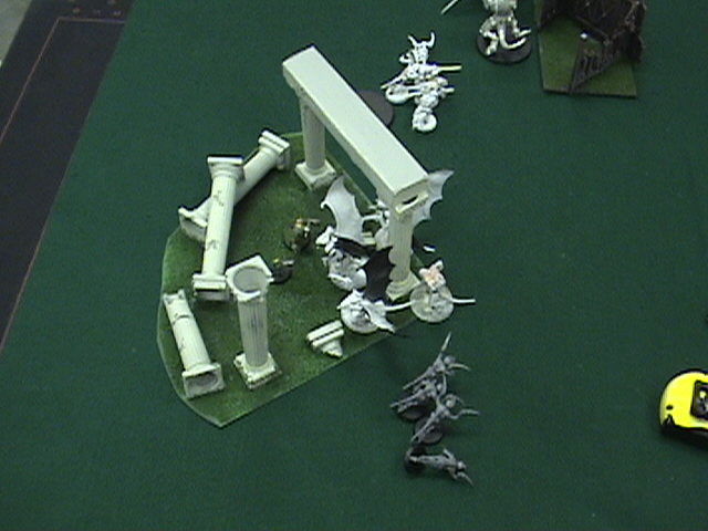 turn 3 all his units move up, as he blocks me from claiming his Objective, He's playing for the draw now and pours fire into the winged warriors who took 2 wounds. He charges in with two units of gants and his tervagon, and It looks like i'm going to get swamped. I lose a warrior and 2 wounds off of another one, the rest of my first gant and 2 from the other. My troops step up to the plate with 7 wounds from the warriors, and 3 from the tervagon, and 6 from the counter attacking gants! While FnP kept my new gants going his lack of it cost him dearly.