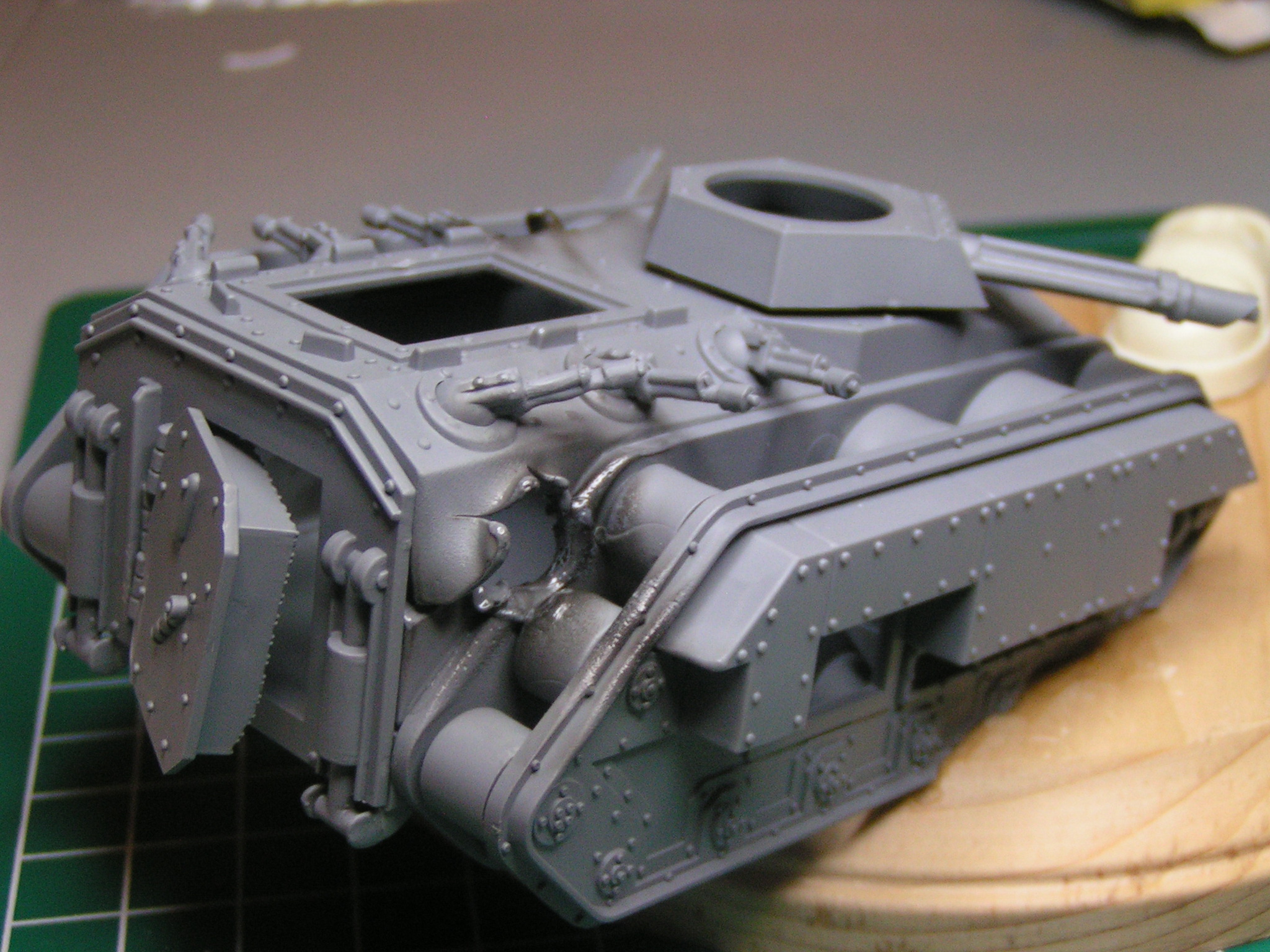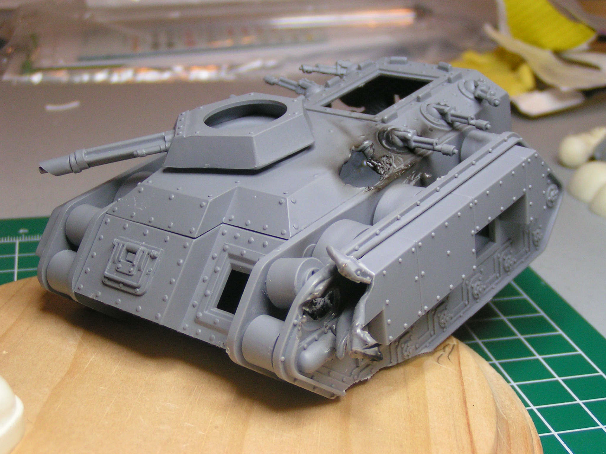 Yep, there was another guy, big daddy, making knights as well. Two of the other ones in this household are his knights. They're great kits, but smaller overall than the one I'm currently building. Also, I had contemplated using a Chaos Rhino, but every chaos story GW makes says something about "virtually half the Imperial Guard/ PDF turned to chaos." so I decided to go with a traitor Chimera instead. It was bigger, and I felt it added more character the piece. I was going to carve the chaos icons into the tank, but felt that wasn't realistic. I mean, how long would it take for someone to actually carve into the armor of an APC, so I'm just going to paint the traitor symbols on instead.