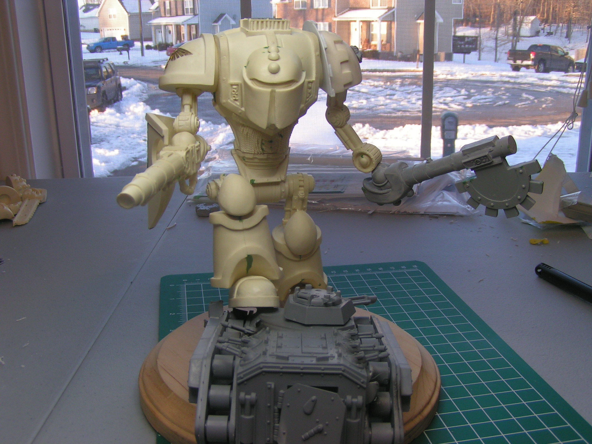 I love the diaroma, but the feet on the knight titan, just dont fit it( reminds me of mickymouse) but over all its get. I would try to plastic card some more armour around the ball joints so they look more sturdier.. but other then that its aces. What color are you going to paint it?