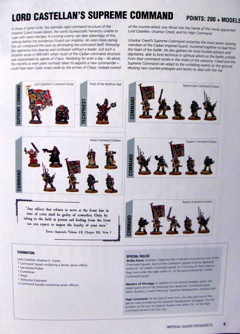 1) Creed's apoc formation requires a "heroic senior officer." In the diagram they have Yarrik modeled. However, his is not a "senior officer." The only senior officers are Company Commanders, who aren't heroic, Creed, who is already in the squad, and Straken, who isn't the modeled officer in the image... nor does he really fit with the feel of this very Cadian, very regmental and not Straken at all... formation.