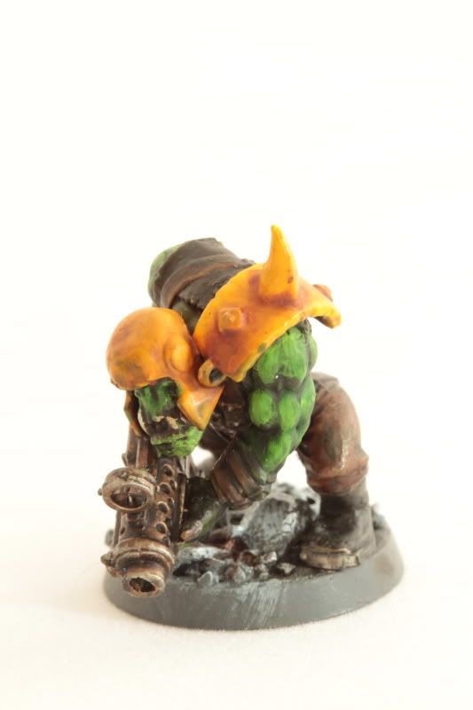 For the skin, it was Orkhide Shade, then Goblin green, then a couple of Badab Black washes, then a goblin green broad highlight, then a scorpion green highlight. I contemplated going one higher with a Scorpion:Bleached bone mix, but decided against it. I then washed it down with Thrakka Green.