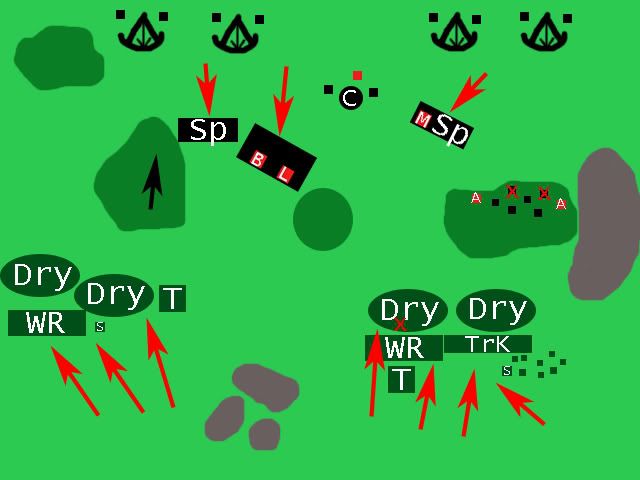 Apparently I would have had a really hard time with his assassins in hth... I never got to find that out since they deployed (and stayed) in the forest for 2 turns. Actually, I made an error in the diagrams- 1 deployed near the spear elves, but immediately moved into the forest during his first movement phase, to join the other assassin and the scouts.