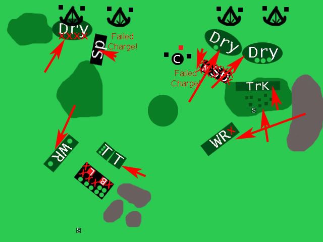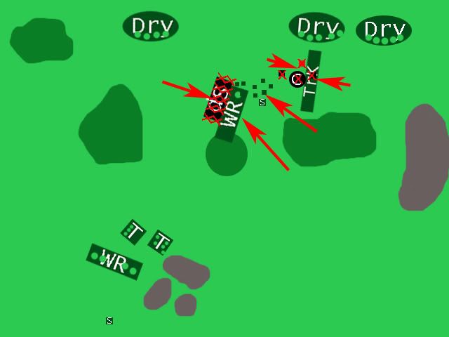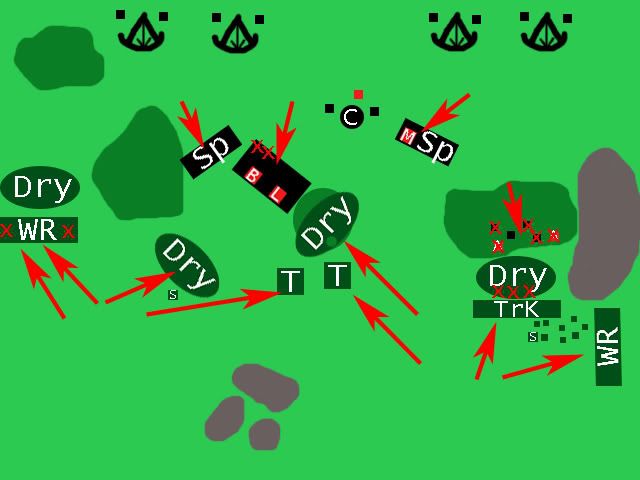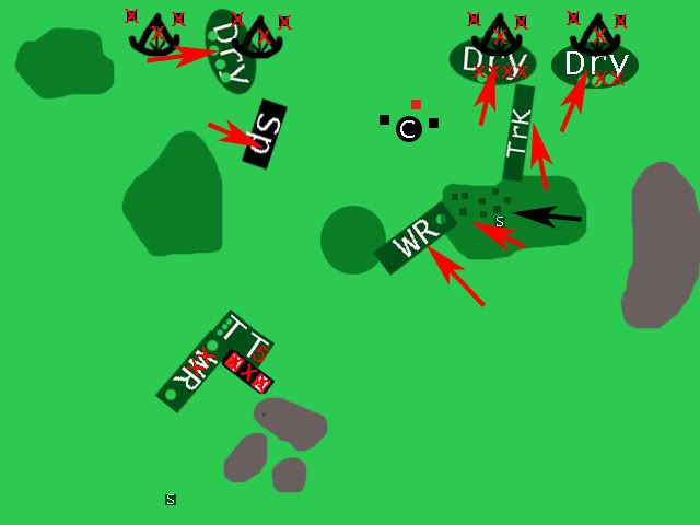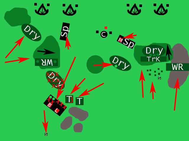 Key: Red X's are casualties, Red Arrows are Movement, Black Arrows are Treesinging, and Holes in units represent casualties from previous turns!