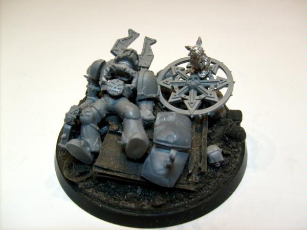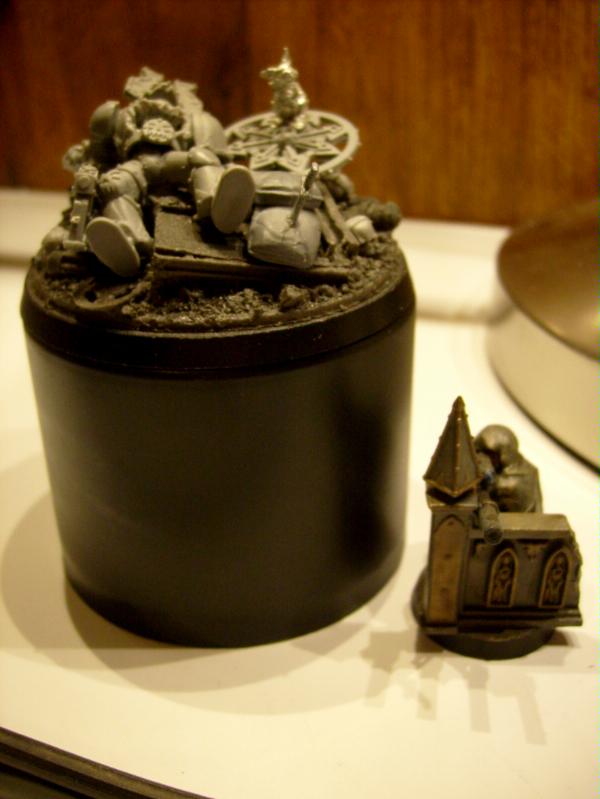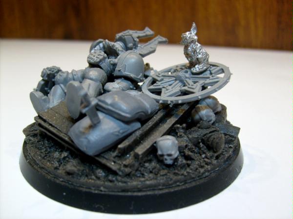 I was thinking about that. The orginal idea was to have a tall rocky out cropping with this guy laying on the top with the bunny on his chest surrounded by headless guardsmen at the base of the out cropping. I just could not get the guard to sit right so I used this idea.