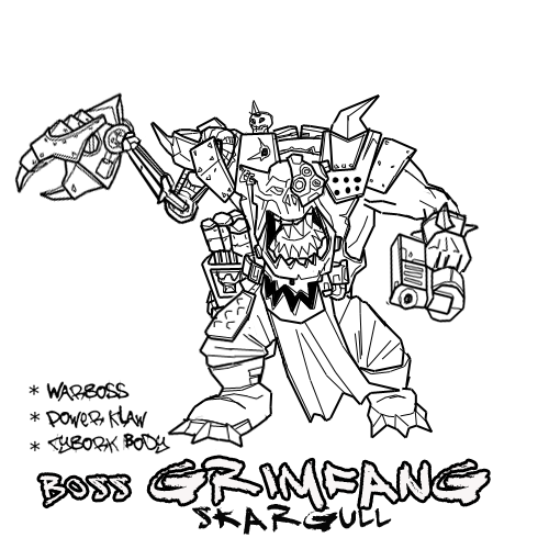 My friend and I started on an orks army recently, well to be fair I had orks and we decided to add more orks and sharing the wealth so to speak. This is the rough idea we had for our warboss after going through both our bitboxes. Its the Black reach war-boss body. With a stickbomb sack hanging from his side. I already chopped of his powerklaw for another conversion and so i will replace it with a nob arm with a slugga, and a bit of greenstuff to power up the arm. Since he has a cybork body i'm giving him the plastic nob head with the bionics and a big fat gob. Then for the arm my friend had this really cool but slightly oversized claw from a CRYX leviathan which we intend to use as a massive powerklaw. The end result i hope should be like the sketch which my friend made, I'm probably going to base him while hes pulverizing some kind of wall or something in his way with the claw. I'm having the gun slightly angled so it looks like he's shooting gangsta style which explains his crappy ballistic skill. The big question is, do you guys think the claw will be to big?