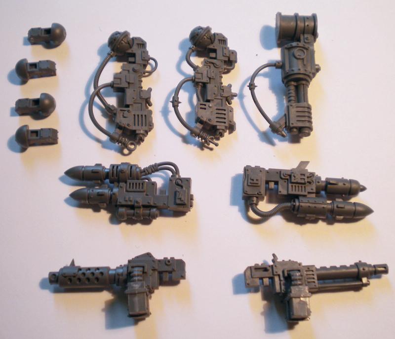 You get a pair of Rokkits, Big Shootas, and Mega-Blastas, and one Scorcha. The Rokkits and Mega Blastas are one-piece; you have to glue the ammo bins onto the Big Shootas and the back of the Scorcha with the fuel tanks is a two-part piece. The all slot onto little ball-joints that fit onto the main body.