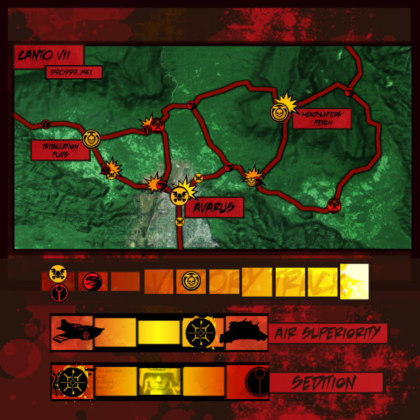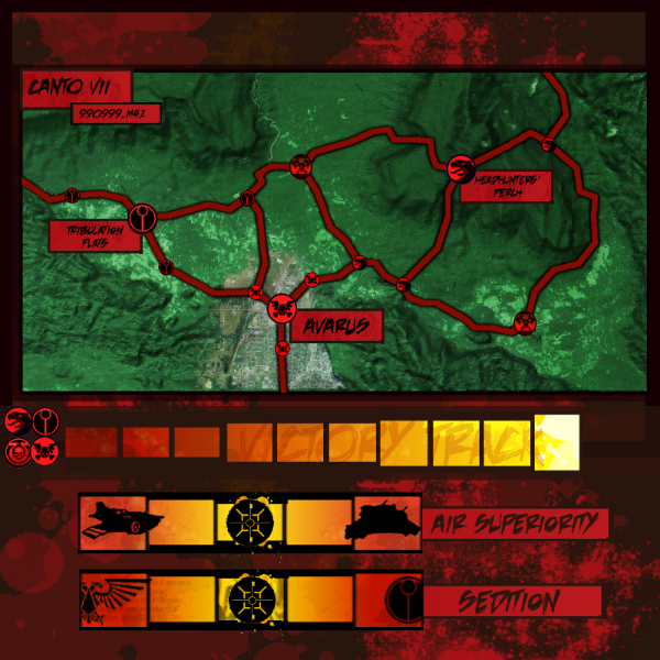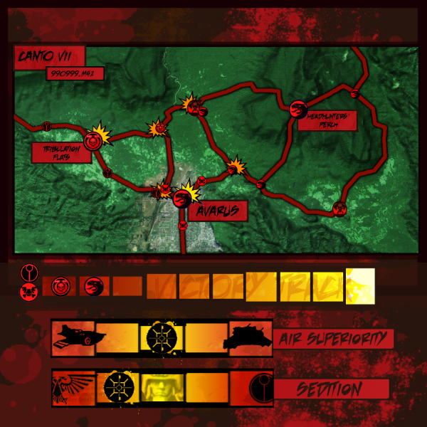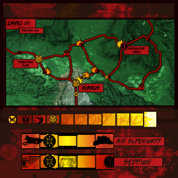 The Sedition Track - this track shows the morale of the guard that have been mired in a stalemate for the last four years against a dug in foe. Now, new forces have landed, these promising an end to the fighting and escape from the planet. Scoring on this track is a one block shift for each successful assault (not patrol). The Ultramarines count successes as double shifts. The Tau and "Sons of Canton" can influence this through use of the Water Castes.