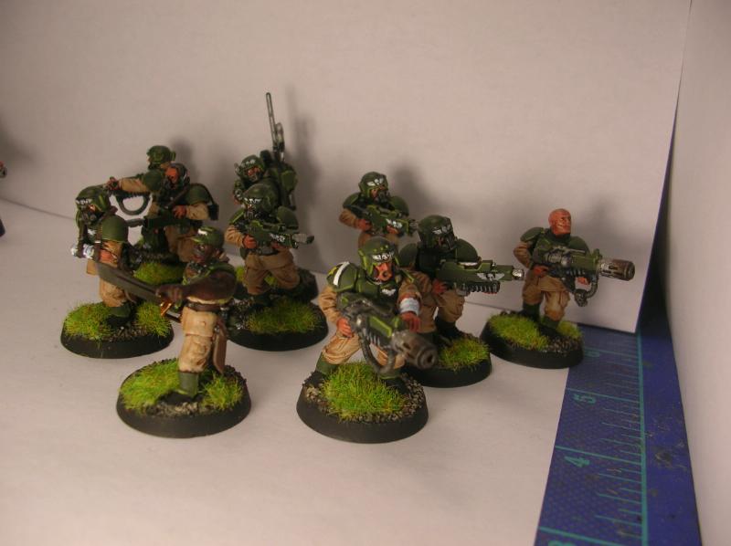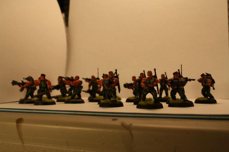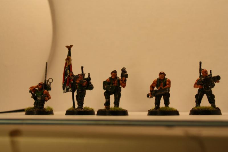 Here's my combined force of Cadians and Catachans so far. We've got an infantry squad each of Cadians and Catachans, a Catachan veteran squad, and my platoon command. The veterans are currently missing a sergeant, since I don't have the Sergeant Harker model yet.