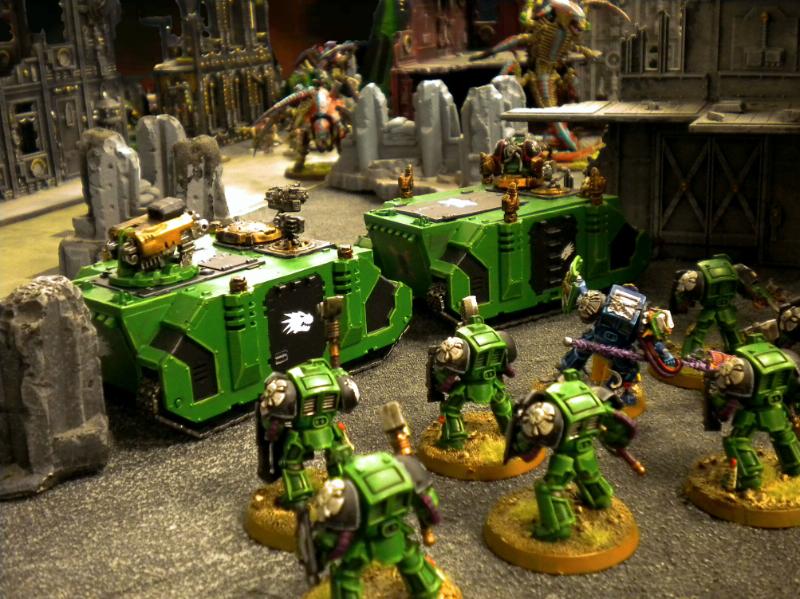 Salamanders: One of the two Pods hits the ground right in the middle of my burgeoning battleline and the Dreadnought clambers out. Two Razorbacks and a Rhino packing Tactical marines roll on across from the Tervigon; one Razorback and the Rhino wall up in front of the Terminators with the Librarian. The Dread lights up the fighting Warriors, five wounds get through and drop one Warrior with two wounds outstanding. The main force bunker up by John’s edge.