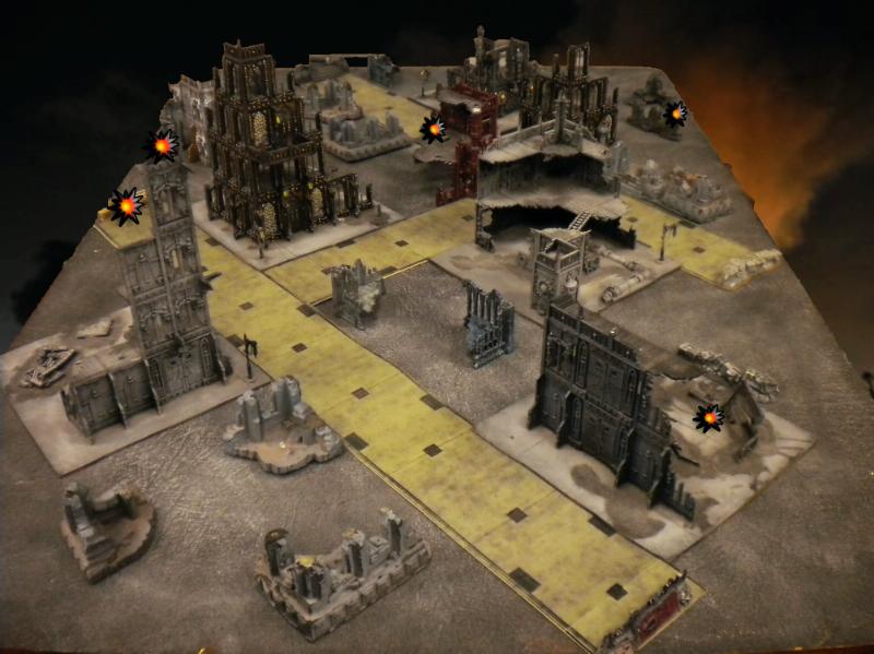 Two near my table edge, one in the ruined Administratum building in the foreground, and one behind some ruined walls on the other end; two near his edge, one on the top spire of the tall grey building, and one near the roadblock behind the big black Sanctum. The final objective was center-east, just next to the street behind the red Mechanicum building.