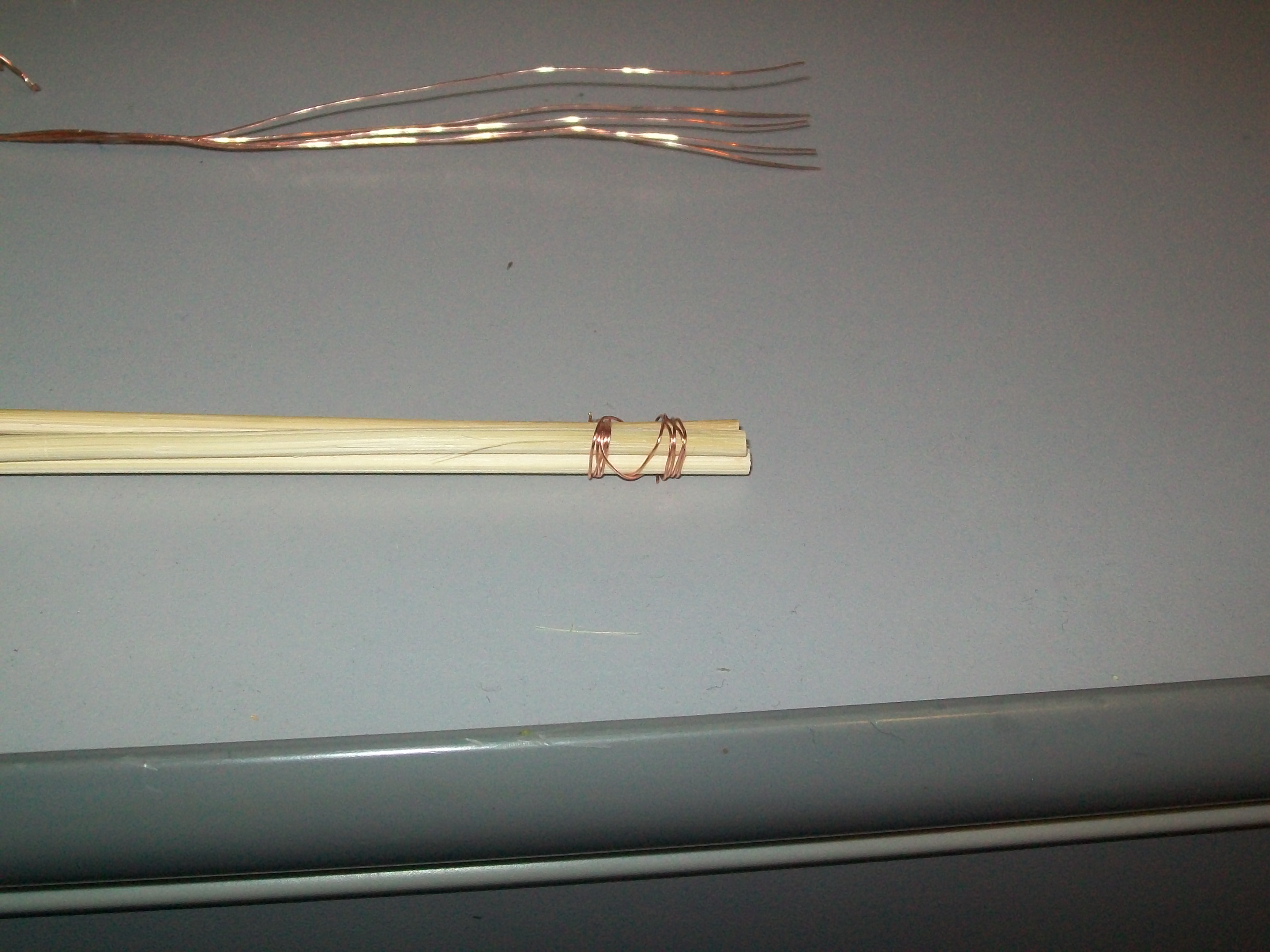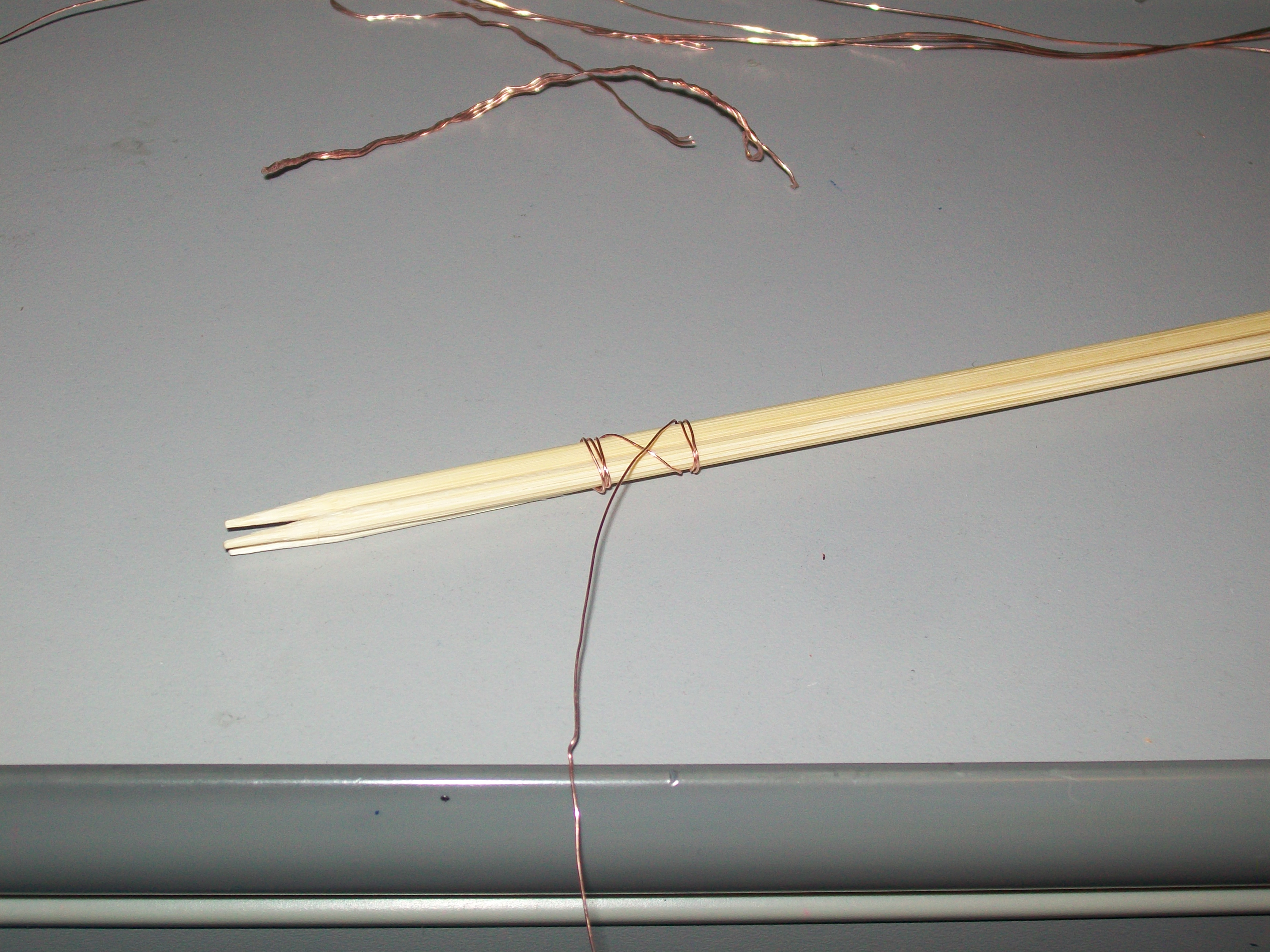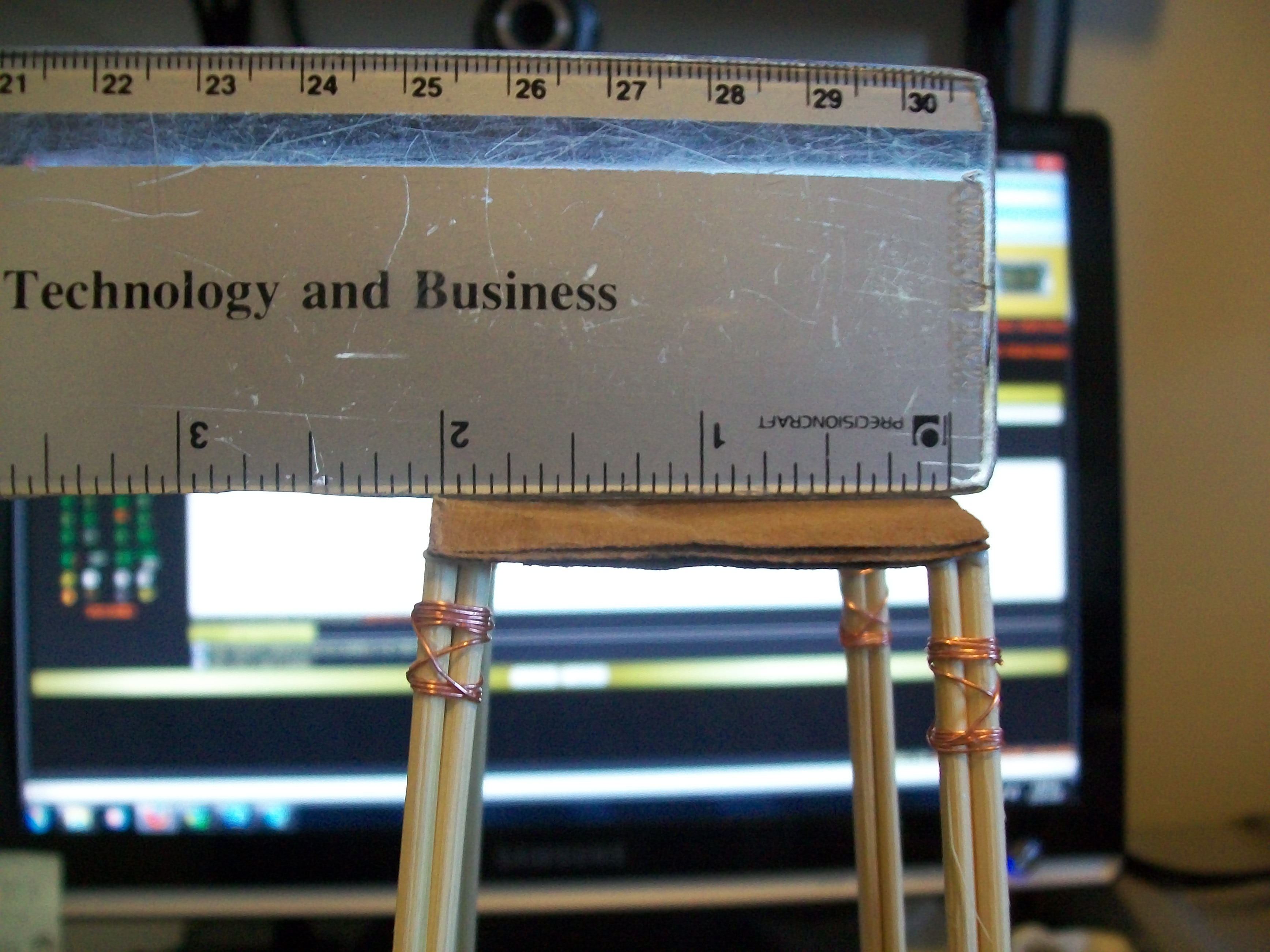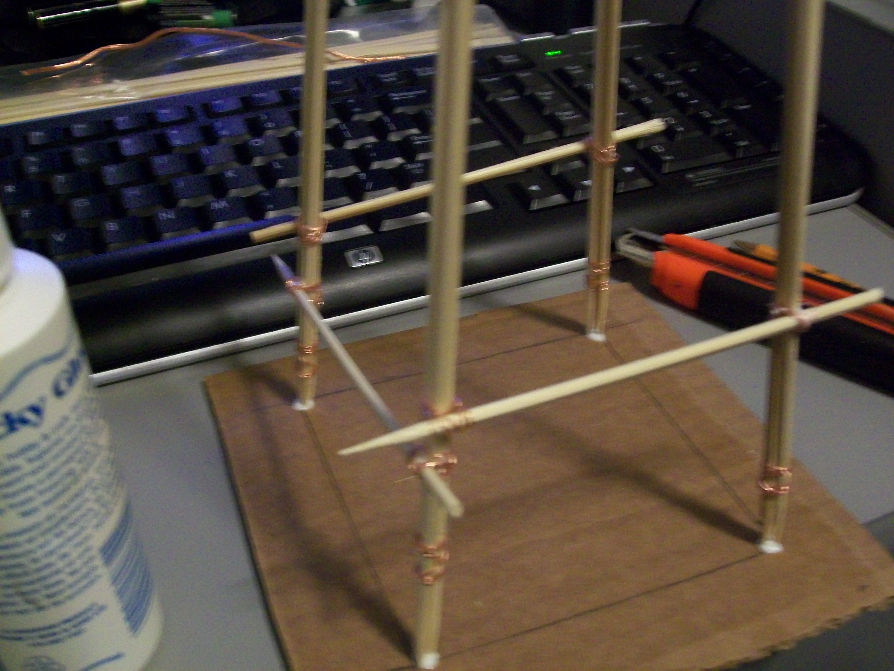 After I lashed the poles together I ran some pvc glue on them to make sure noone poked themselves on the wire. Then I based it on a 6" by 6" peice of cardboard so I could work around it. Which all joined up at the top to a 2 inch peice (the base of the legs are 4" by 4")