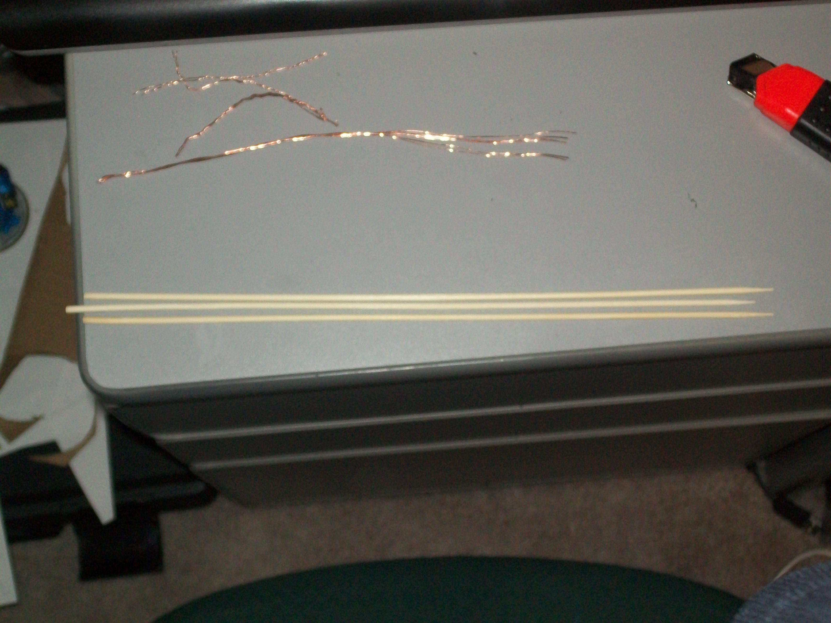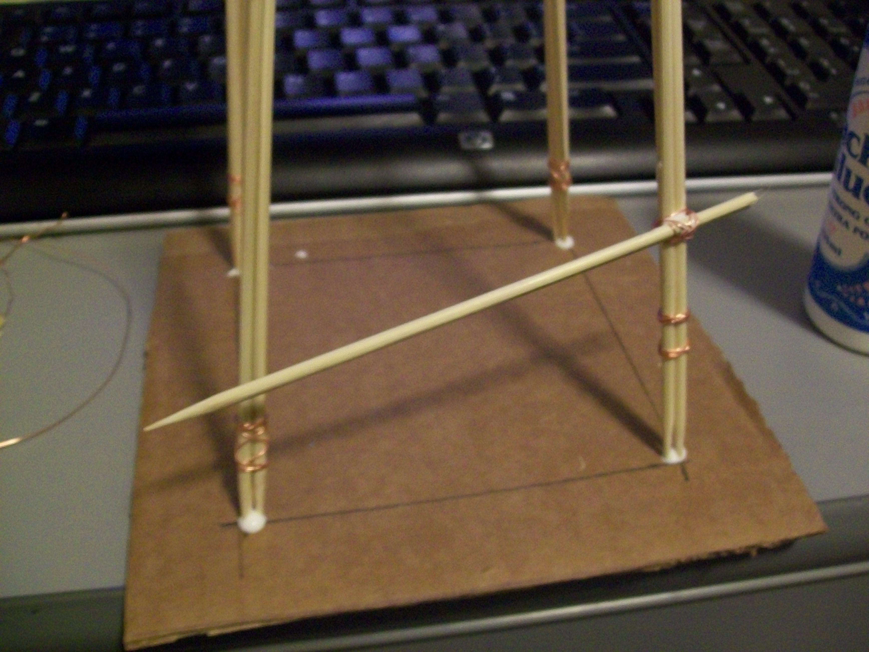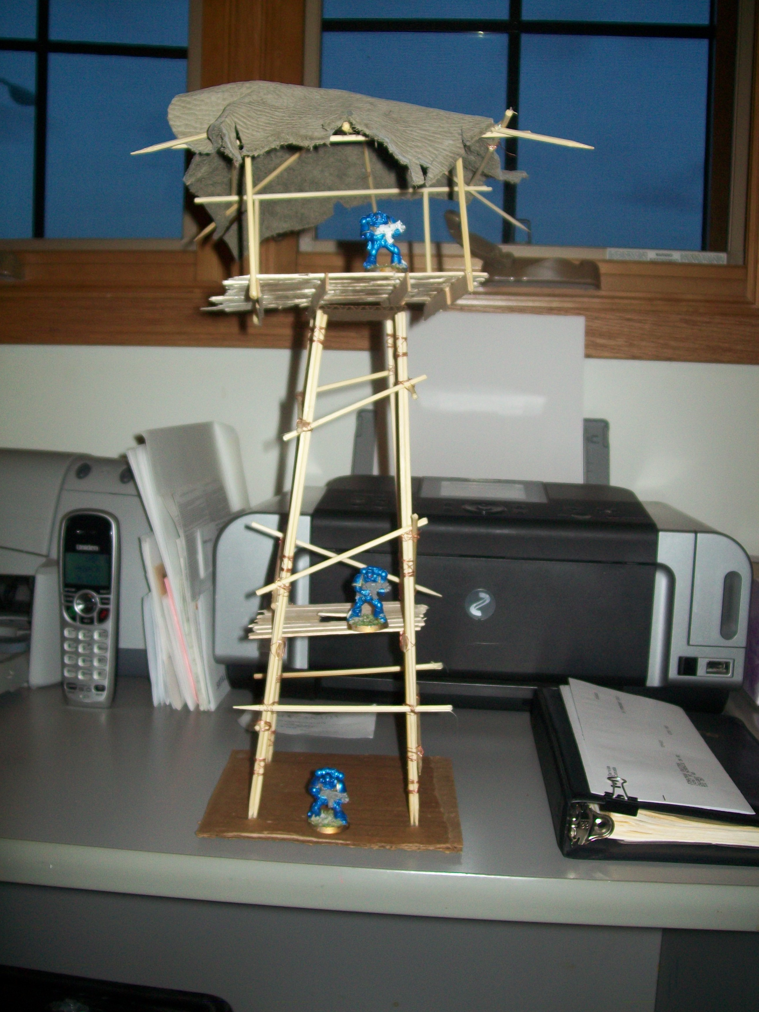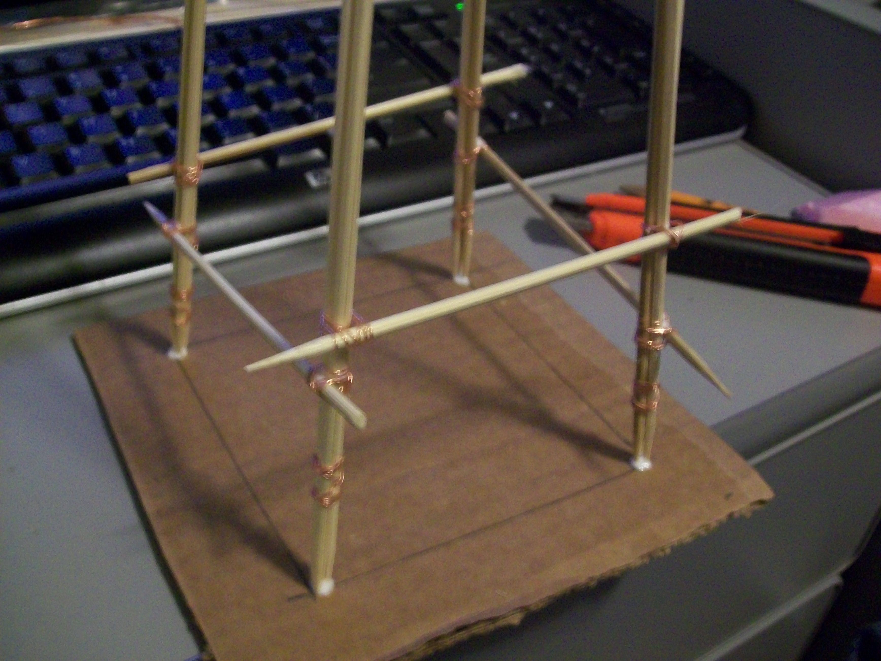 Here is the start of my 1 foot tall orky tower which will have special rules for it when I play with my friends. (Like units fire 1.5 times farther or something like that) Its made out of bamboo skewers, wire and cardboard. The first thing i did was lash 3 skewers together with the wire to make poles that looked orky.